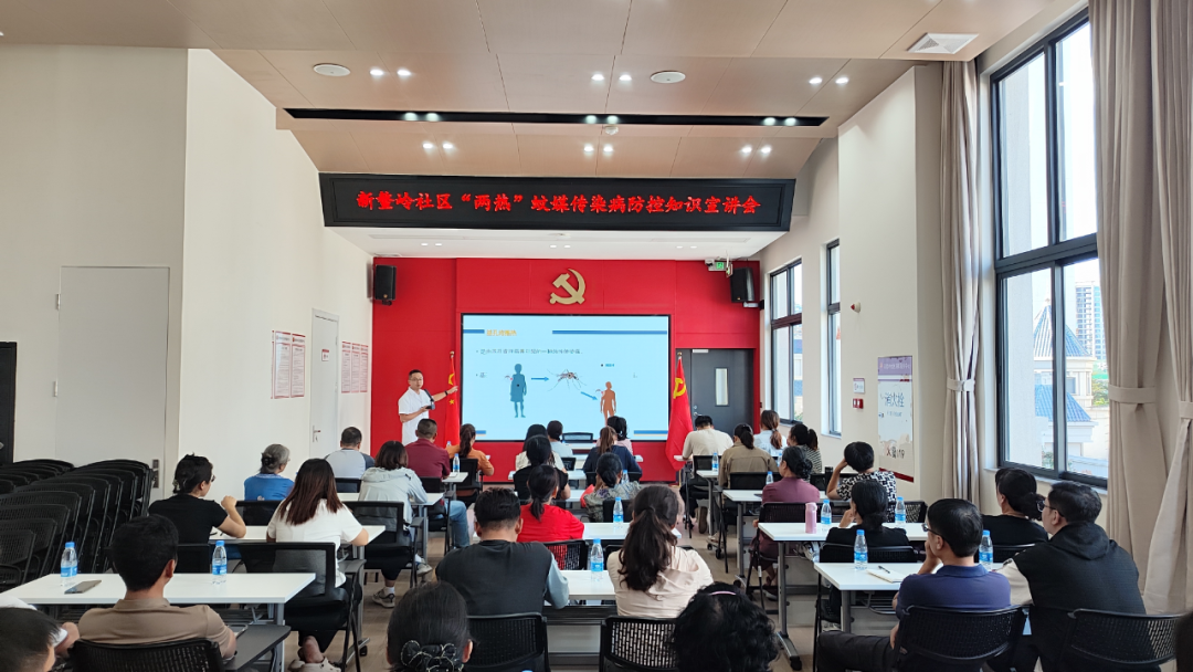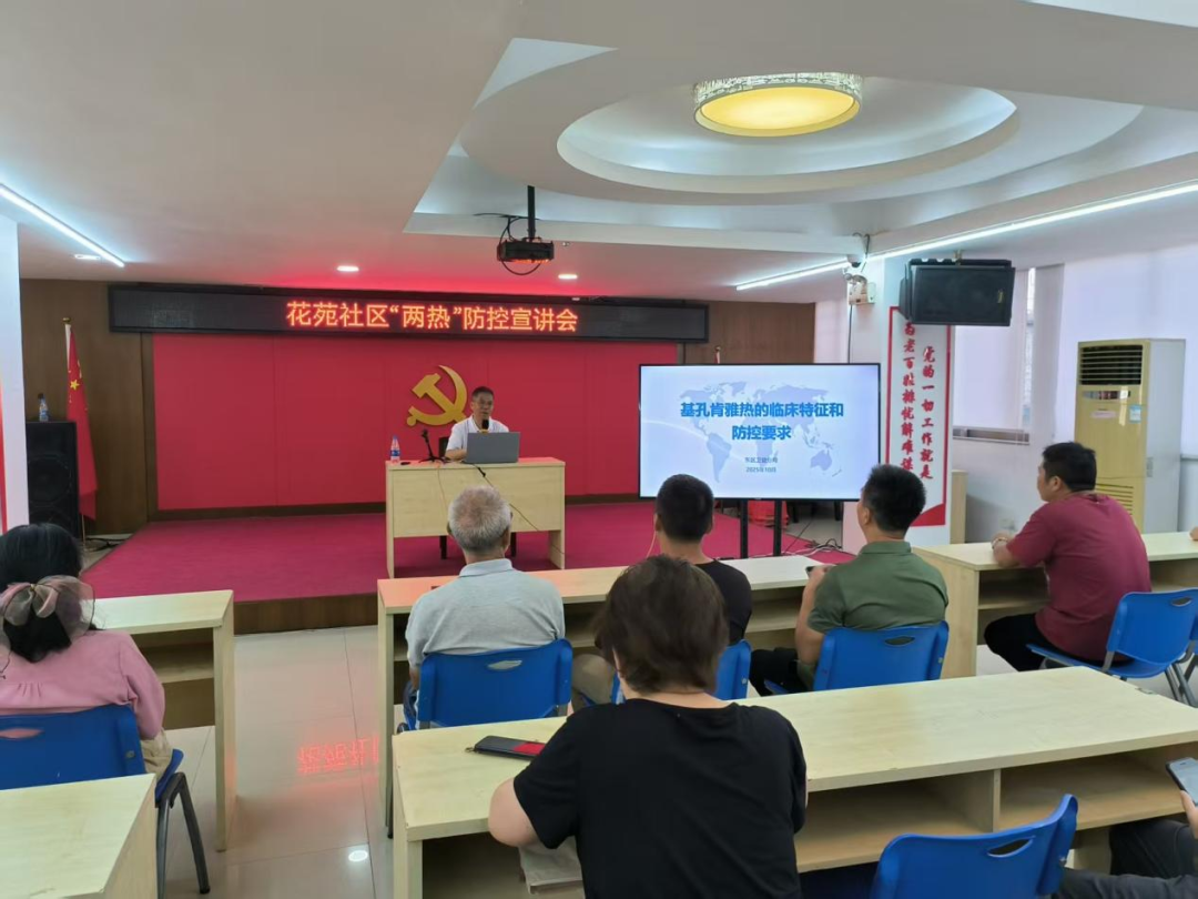 在新鳌岭社区的会议室内,蔡医生用通俗易懂的语言,结合图片、视频为居民们讲解了“两热”的特点、日常个人防护要点、如何科学消杀等重要性。针对居民们最关心的问题,蔡医生一一给出了科学解答。
