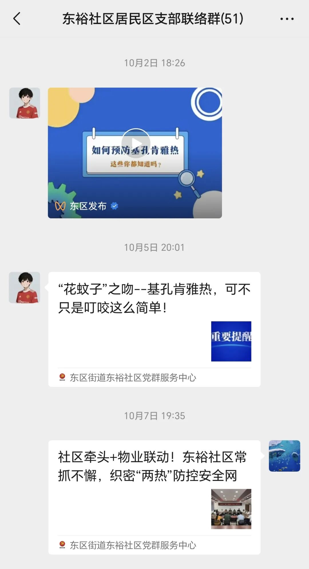 “互相提醒”成了邻里情:在电梯间、楼下小公园等,物管、邻居们会友善地提醒对方出门要喷驱蚊液,要注意做好个人防护等;在居民微信群里,大家会分享科学的防疫小贴士。