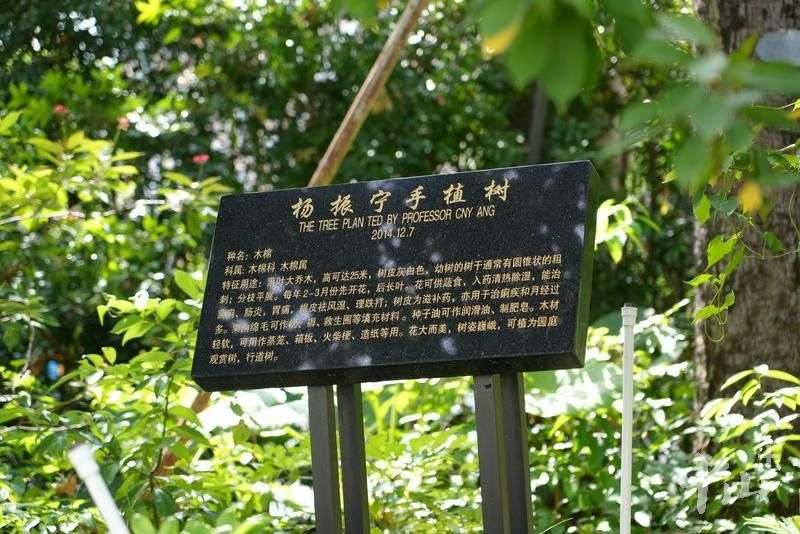 10月20日,记者在现场看到,这棵树已枝繁叶茂,屹立于高中部校门左侧绿化带内,大树前方的铭牌上写着一行大字“杨振宁手植树 2014.12.7”。