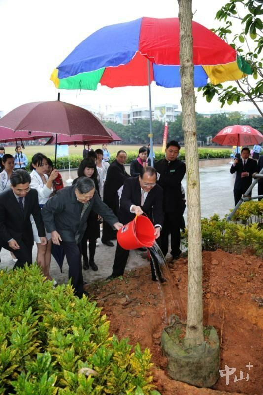 2014年演讲结束后,杨振宁与蔡冠深在侨中高中部校园种下一棵木棉树。