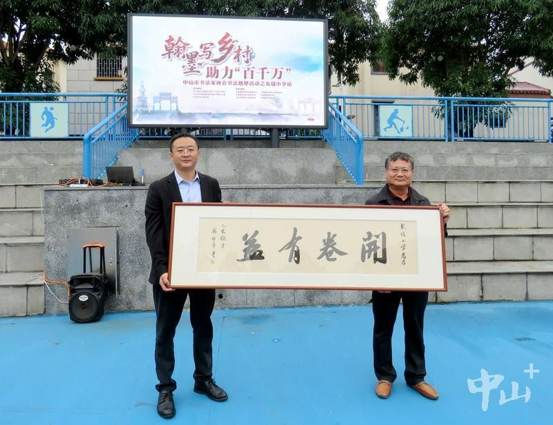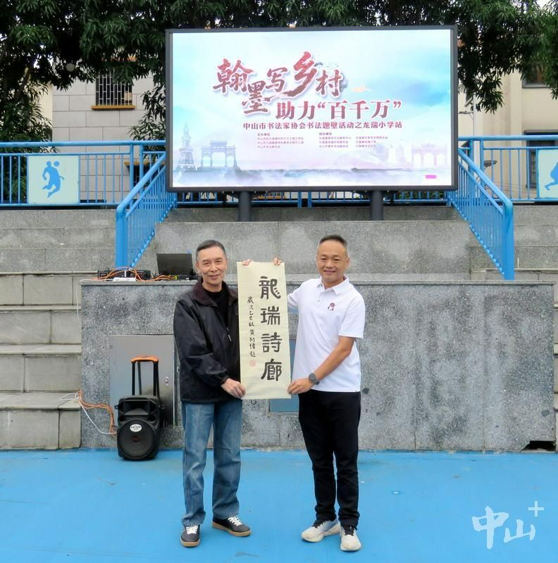 龙瑞村是题壁活动的首站。在启动仪式上,市书协主席骆培华向龙瑞小学赠送书法作品《开卷有益》,市书协名誉主席黄衍增则分别向龙瑞村、龙瑞小学赠送书法作品《龙瑞诗廊》及书籍。“书法题壁活动是书法艺术与乡村建设深度融合的创新尝试。”市书协主席骆培华表示,策划并启动大规模的题壁活动,旨在以书法装点美丽乡村,传承乡土文脉,提升乡村文化品位,为中山市深入推进“百千万工程”建设注入强劲的文化动能。