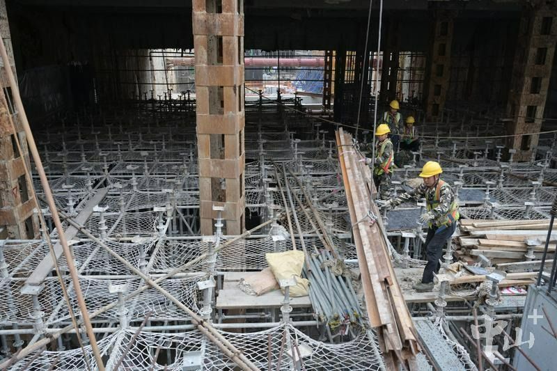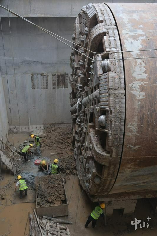 下午3时,富康路与康华路交叉路口建设工地,地下20米的施工现场机器声轰鸣,施工人员正在进行石岐站接收井下渣土清理以及盾构机内部拆解施工。
