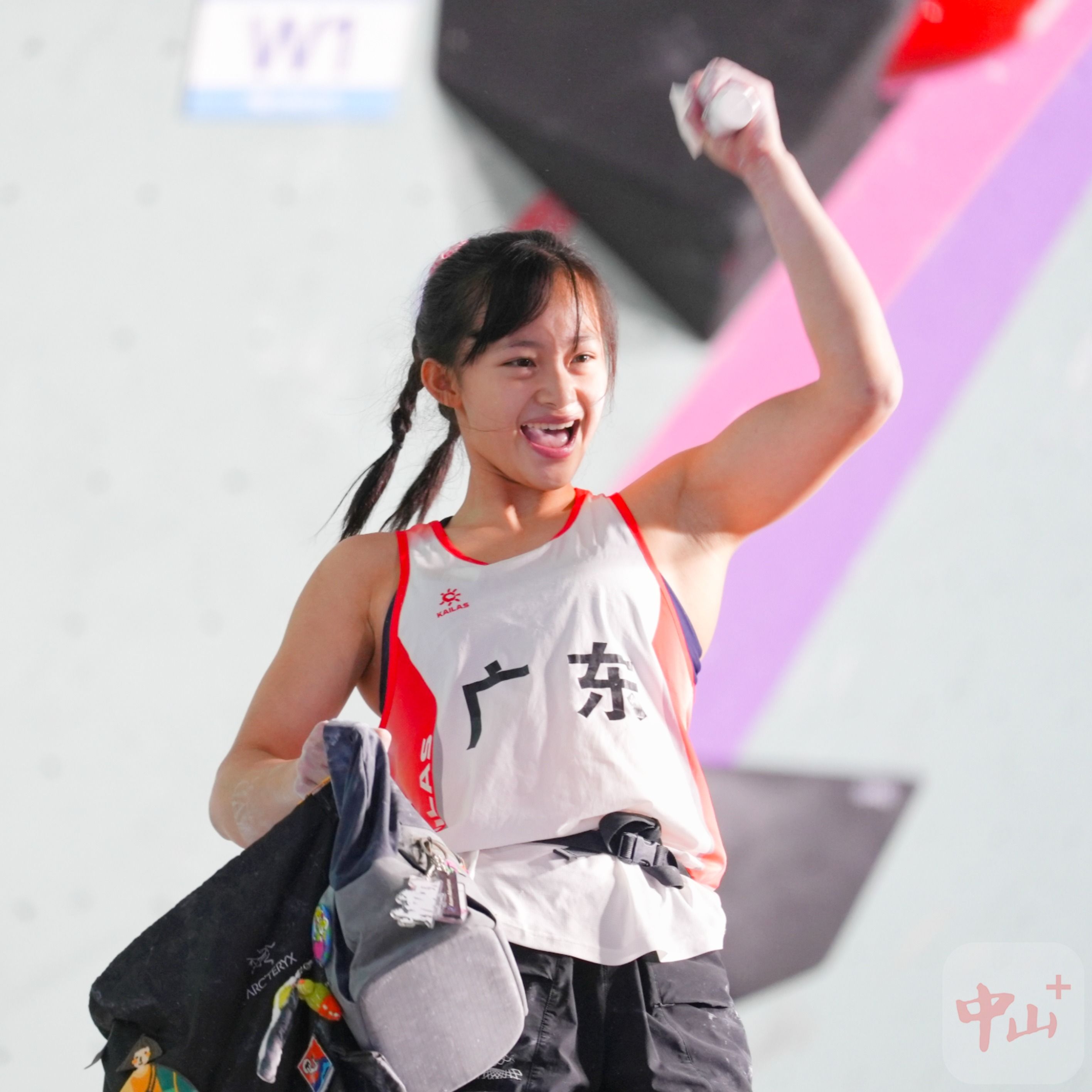 决赛现场,李美妮站在岩壁前沉着观察岩点布局,冷静推演攀爬线路,她在岩壁上的每一步都非常稳健,成为全场唯一完攀爬四条线路的选手。当李美妮成功锁定最后一个赛点时,全场气氛达到高潮,她的母亲与广东队陪队人员激动相拥。最终李美妮以总分99.2分夺冠,成为本届全运会中山选手中最年轻的冠军。