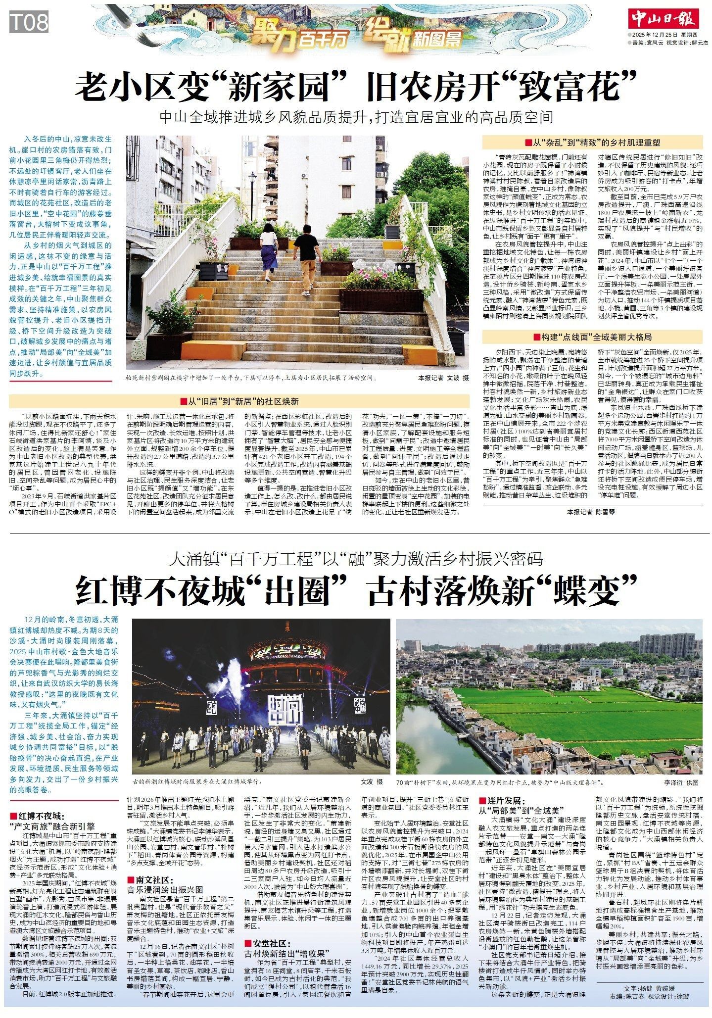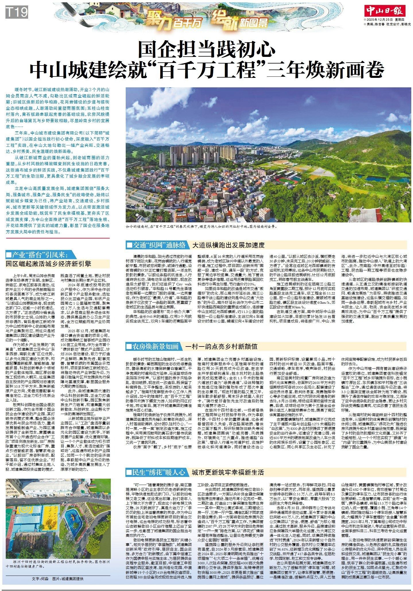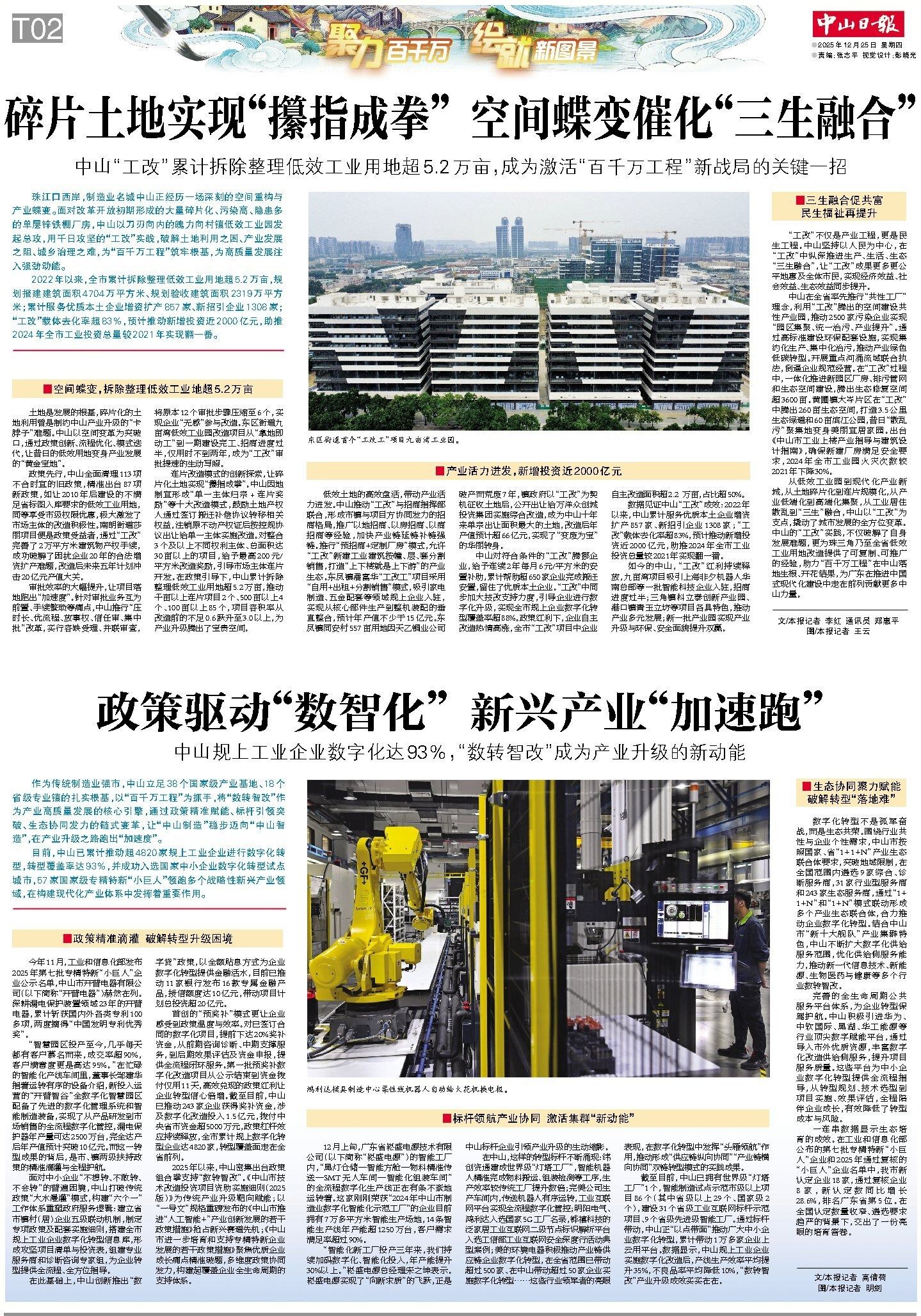 空间腾出新载体——累计拆除整理低效工业用地超5.2万亩,超2100家企业落地中山;产业迸发新动能,规上工业企业数字化转型覆盖率达93%,战略性新兴产业聚链成群,2024年工业投资总量较2021年实现翻一番;生态捧出“金饭碗”——城镇建成区基本消除黑臭河涌,106条主干河流全面消除劣Ⅴ类,累计完成生态修复超3600亩,昔日黑臭的横涌变身生态水带,引来山姆会员店、奇遇时光乐园等项目,曾经“散乱污”企业聚集的大岑片区改造成为三生融合空间,吸引一批亿元企业进驻;形态提升焕新颜——广澳、广珠西线等“10+2”重要道路风貌大幅提升,累计改扩建公园242个,改造提升农房超6万户,加快活化利用5029间侨房,“点、线、片、带、面”全域突破、全域升级。