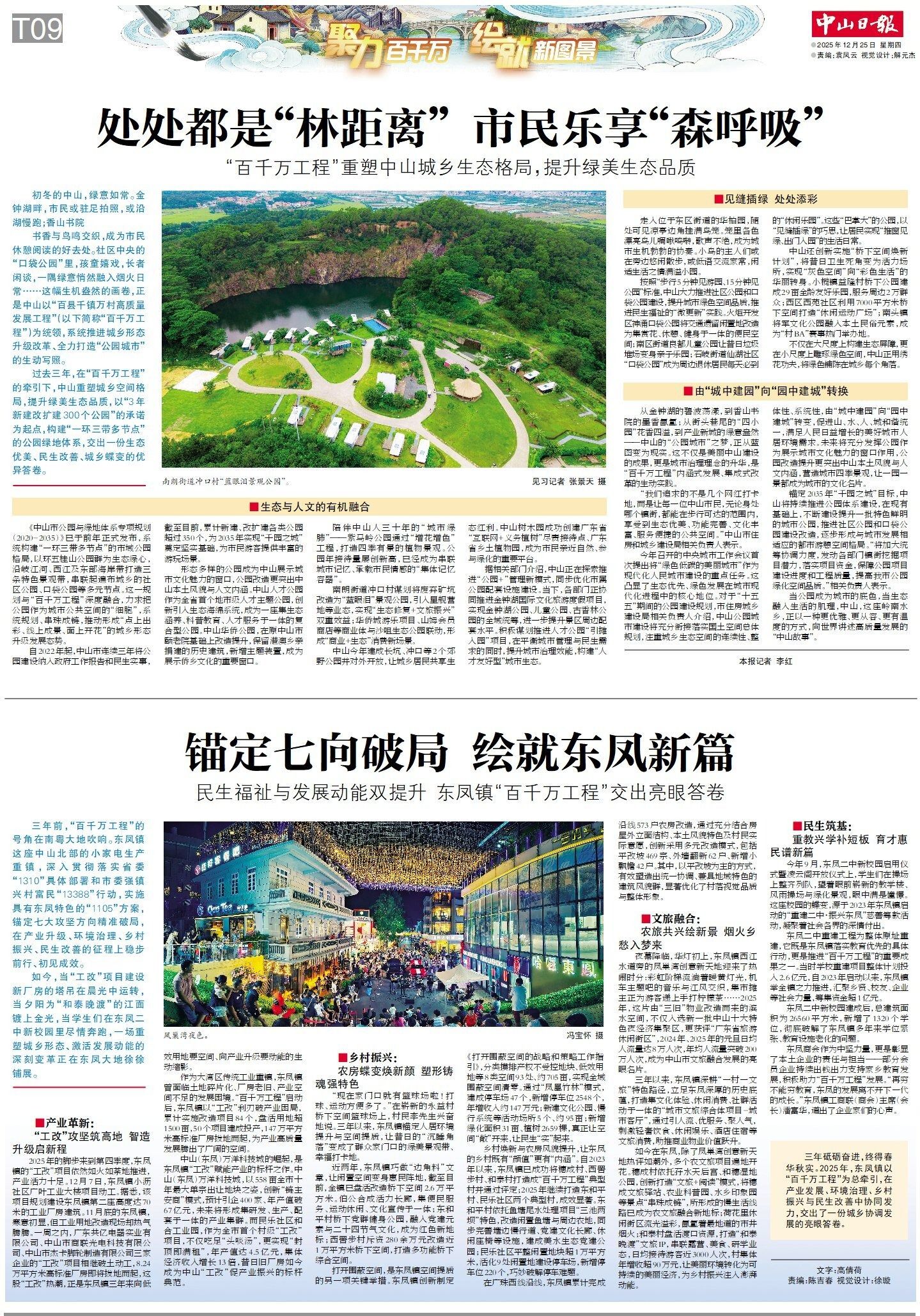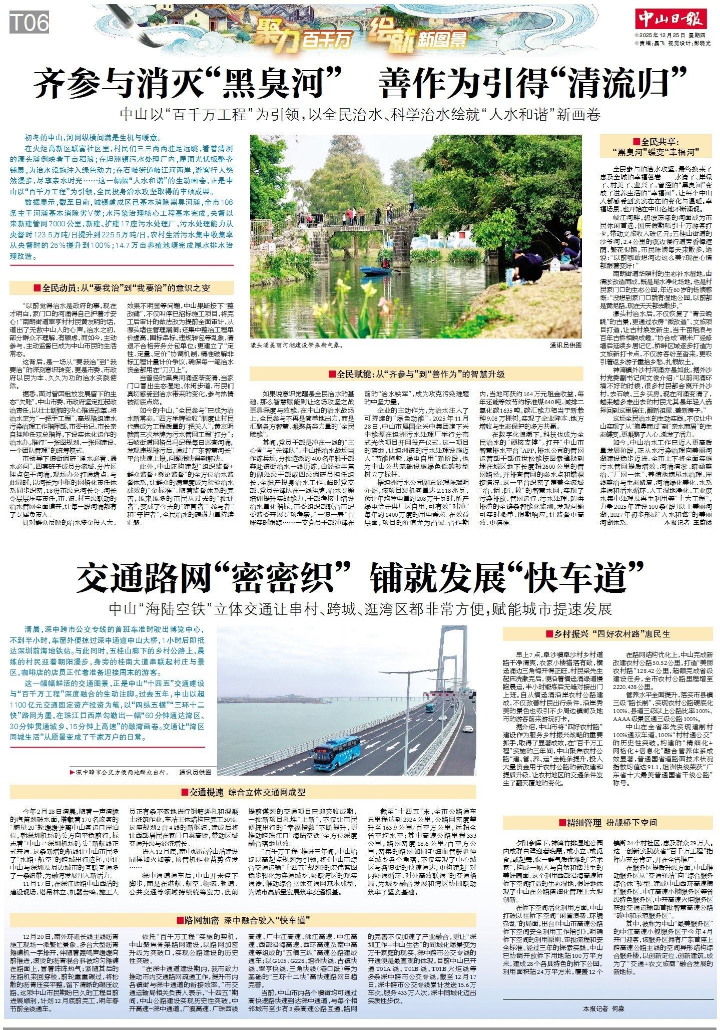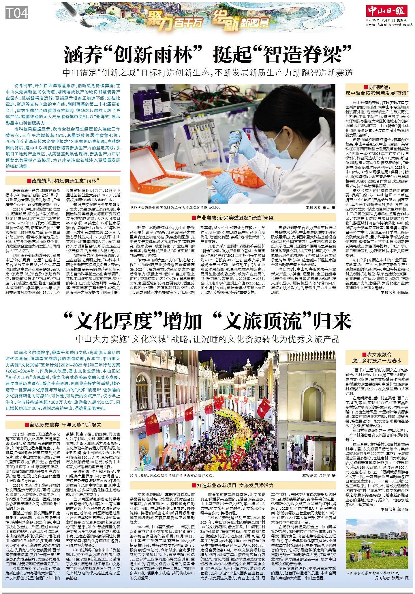 空间腾出新载体——累计拆除整理低效工业用地超5.2万亩,超2100家企业落地中山;产业迸发新动能,规上工业企业数字化转型覆盖率达93%,战略性新兴产业聚链成群,2024年工业投资总量较2021年实现翻一番;生态捧出“金饭碗”——城镇建成区基本消除黑臭河涌,106条主干河流全面消除劣Ⅴ类,累计完成生态修复超3600亩,昔日黑臭的横涌变身生态水带,引来山姆会员店、奇遇时光乐园等项目,曾经“散乱污”企业聚集的大岑片区改造成为三生融合空间,吸引一批亿元企业进驻;形态提升焕新颜——广澳、广珠西线等“10+2”重要道路风貌大幅提升,累计改扩建公园242个,改造提升农房超6万户,加快活化利用5029间侨房,“点、线、片、带、面”全域突破、全域升级。