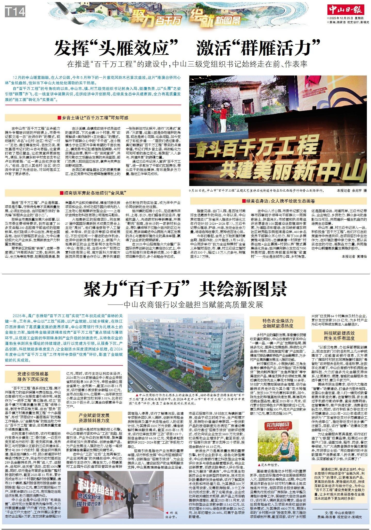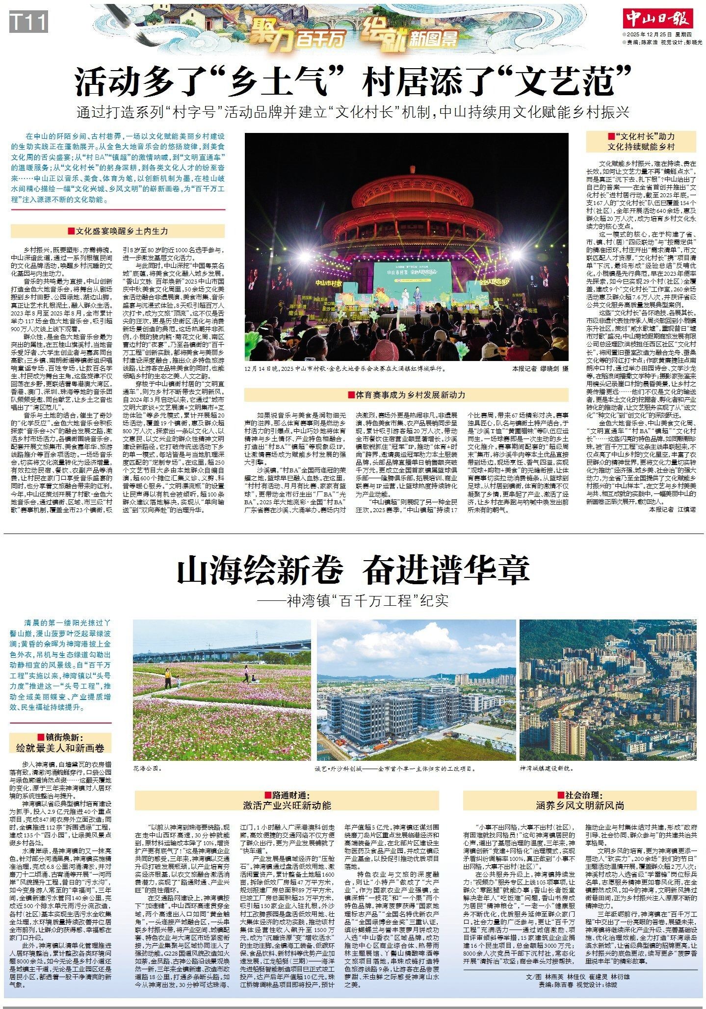 稻香与咖啡香两相宜,美食与美景相辅相成,“火车”“星际”民宿开进原野,新兴业态打开乡村发展新模式;典型村脱胎换骨,农产品亮出品牌,强村公司引来超亿元村企业,城乡收入比持续缩小,镇村经济长足发展;孙中山故居片区改造提升,香山古城孙文西路步行街焕新开放,大涌红博不夜城精彩出圈,万亩红树林湿地公园、崖口乡村旅游度假区等重点文旅项目加快建设,环五桂山“百千万工程”高质量发展引领区释放活力引力,吸引一批填补空白的标杆文旅项目。乡村各美其美、美美与共,在产业发展、建设、治理的系统工程中蝶变,铺展“强镇兴村富民”美好图景。