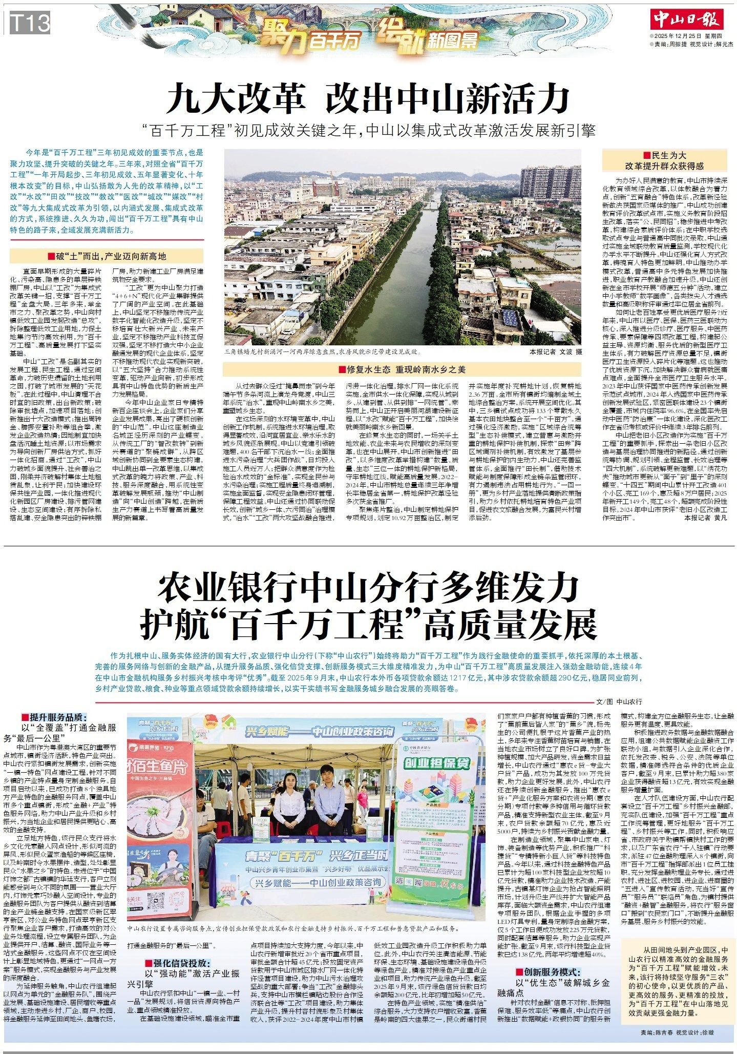 广东破解城乡区域发展不平衡难题,最重要最关键的抓手是“百千万工程”。中山深入实施“百千万工程”,既是省域全局的考量,又是自身经济发展的必要、生态保护的必须、城乡统筹的必然。长期积累的土地空间瓶颈、水污染治理等“硬骨头”绕不过,改革发展的涉滩之险、爬坡之艰、闯关之难躲不开,唯有攻坚克难,一往无前。爬坡闯关,靠的是风清气正的政治生态、干部队伍的担当作为,凭的是敢为人先、不甘人后的改革思维。中山在“工改”“水改”基础上,一体推进“田改”“城改”“技改”“教改”“医改”“媒改”“村改”,形成九大集成式改革,刀刃向内破解发展难题,不断增强人民群众改革获得感。