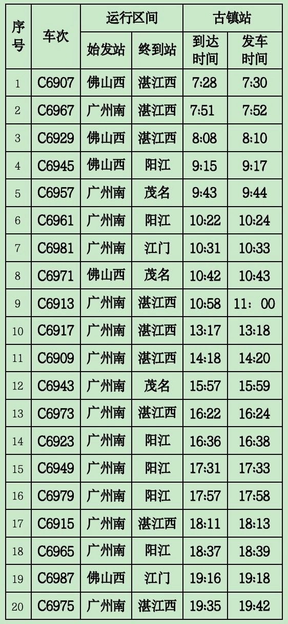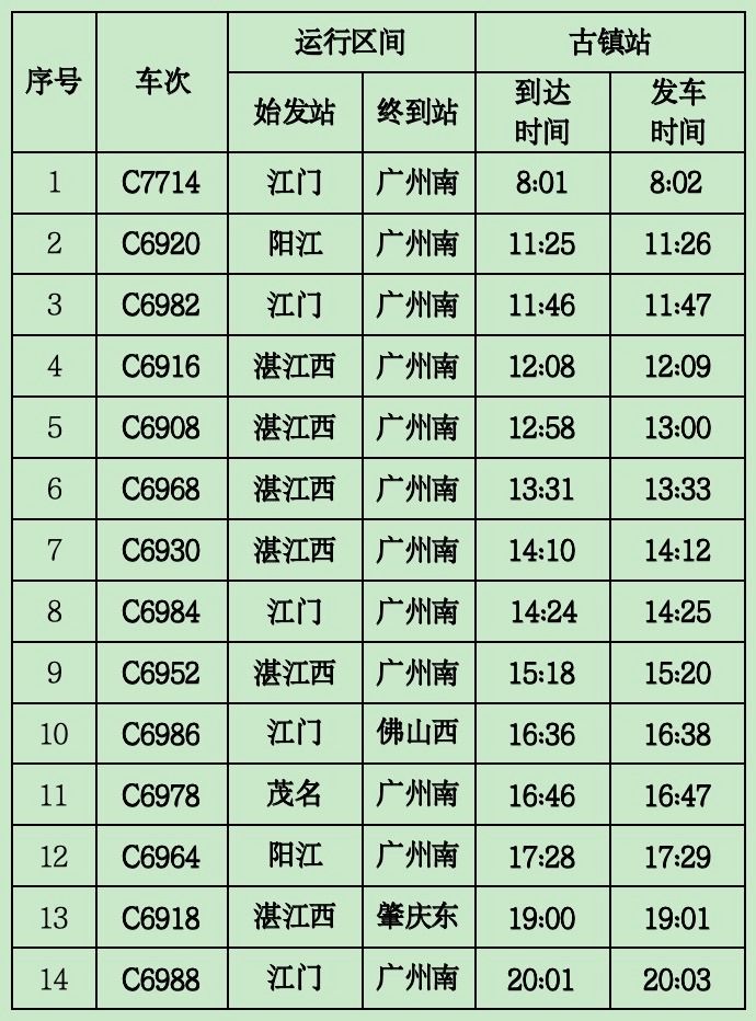 古镇站具体开行列车信息