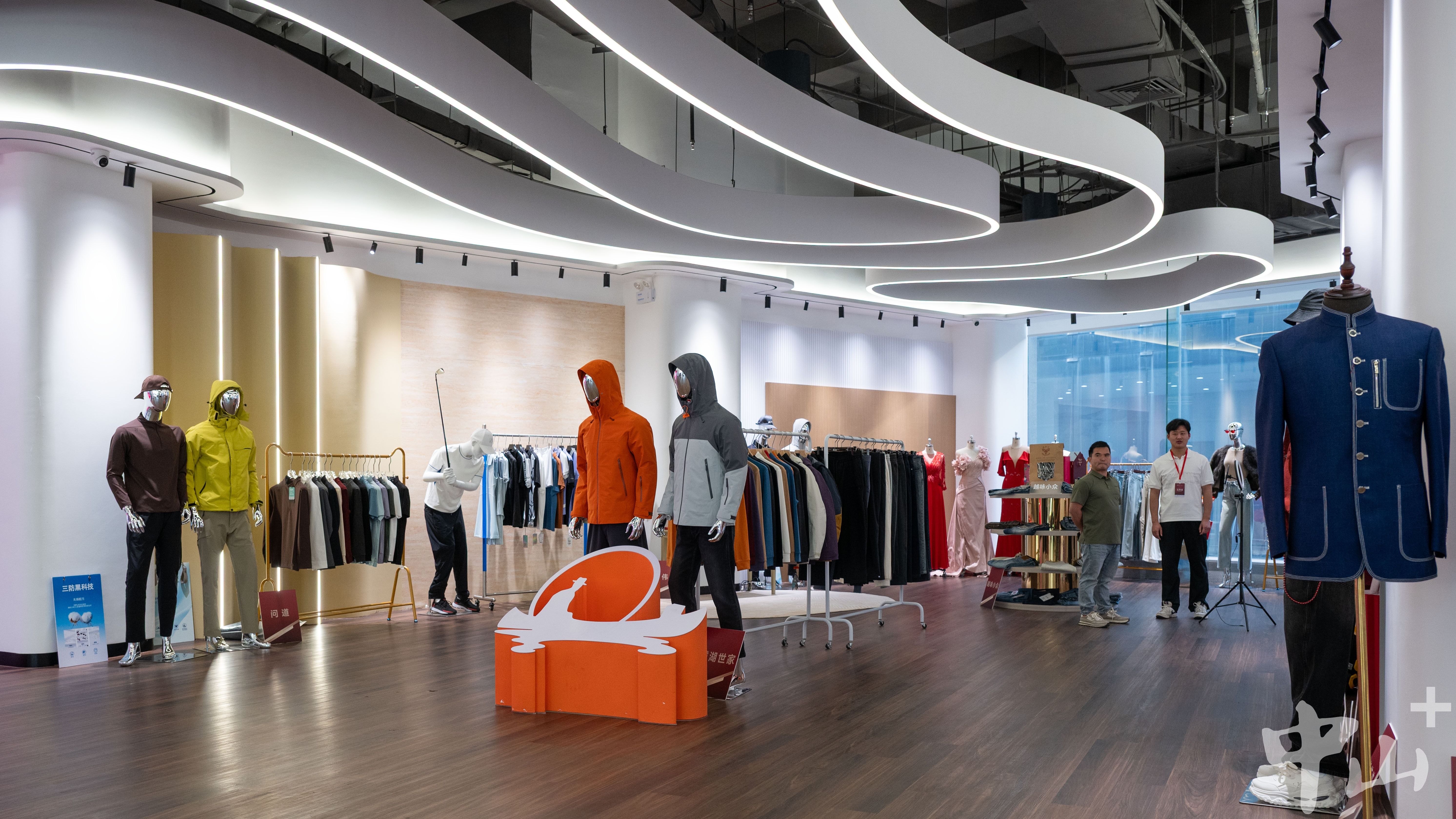 在近1万平方米的选品中心,可以看到一套完善的一站式直播电商服务体系。品牌展示区里,休闲装、旗袍、家居服等服饰,以及风扇、空气净化器等日用品整齐陈列;线上选品区的电脑端汇聚服饰、食品、日用品等品类,丰富款式可供主播精挑细选;专业直播区功能完备,还配套提供便捷的AI数字人直播服务。