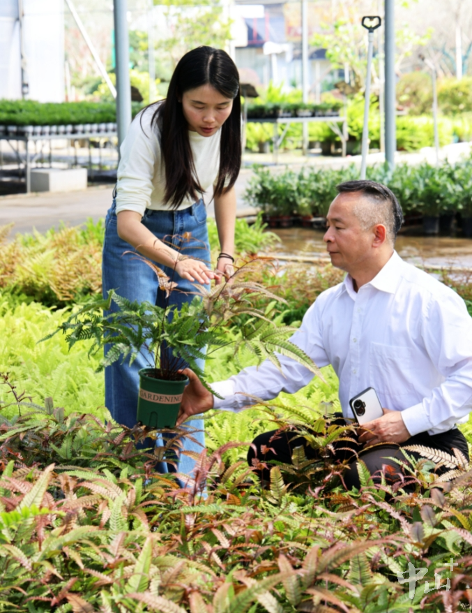 3月12日,植树节恰逢春季育苗耕种的关键时节,素有“中国花木之乡”美誉的中山市横栏镇内,三沙牌坊路一派生机盎然。在中山市广来园林绿化有限公司(以下简称“广来园林”)种植基地内,董事长陈润梅与丈夫吕先生正悉心管护蕨类幼苗,并不时为前来采购的客商介绍产品特点,不多时,数盆彩色蕨类植物就完成装车发货。基地全天候不间断供货发货的繁忙场景,展现出春季花木产销的旺盛态势。