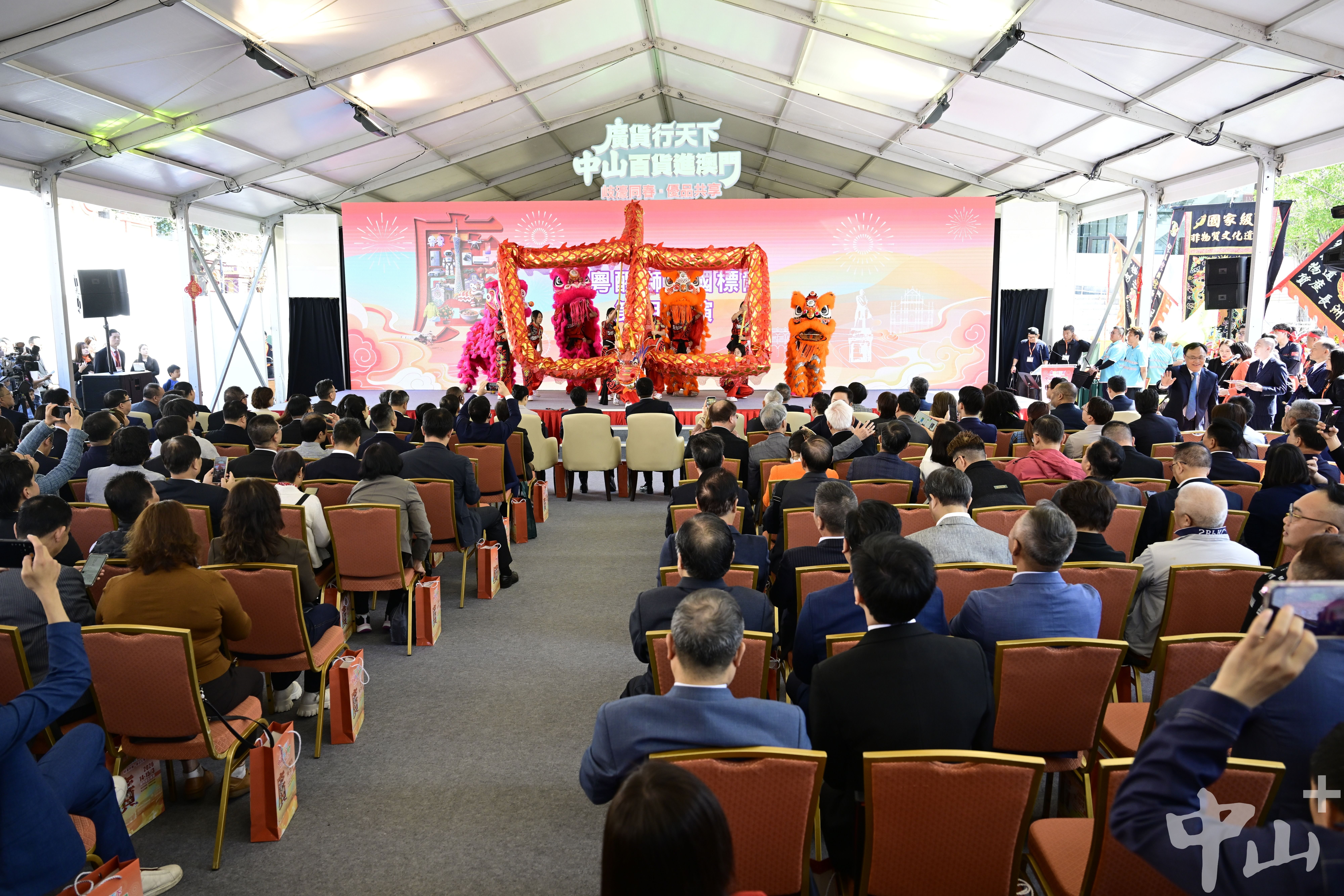 七百多年岐濠同源,是两地合作最深厚的底色,也是这场盛会最动人的旋律。活动现场,中山长洲醉龙舞与澳门醉龙舞同台展演,刚劲灵动的舞姿勾勒出同根同源的文化共鸣;民乐演奏《七子之歌》悠扬响起,曲作者、中山籍音乐家李海鹰亲临现场,熟悉的曲调牵起岐濠两地的悠悠乡情;书法互动区围绕“天下为公”“博爱”现场挥毫,墨香氤氲间传递着中山的人文精神。这些沉浸式的文化体验,让经贸活动有了温度,让澳门市民在购买中山产品的同时,更感受香山文化的魅力;当葡语系国家驻澳代表为醉龙舞鼓掌、为中山书法点赞时,中山品牌也随之走进国际视野,为后续文化交流与产业合作埋下情感种子。