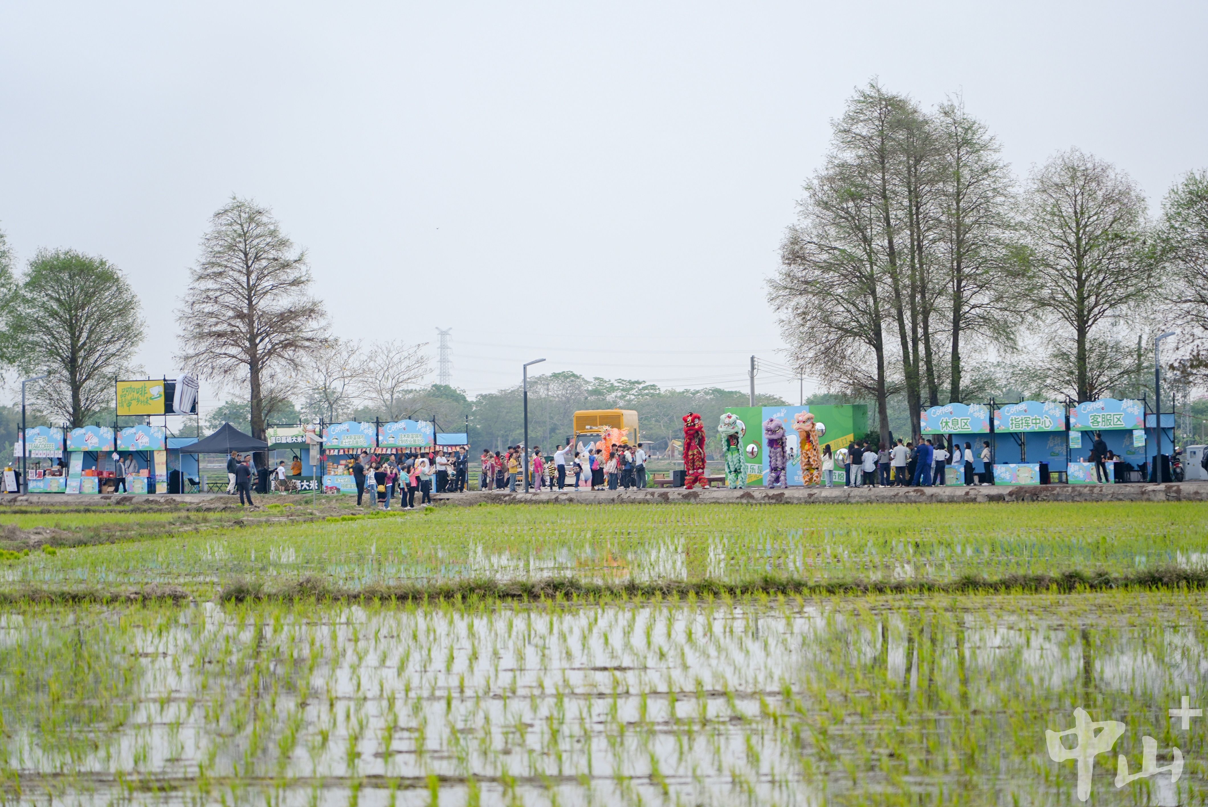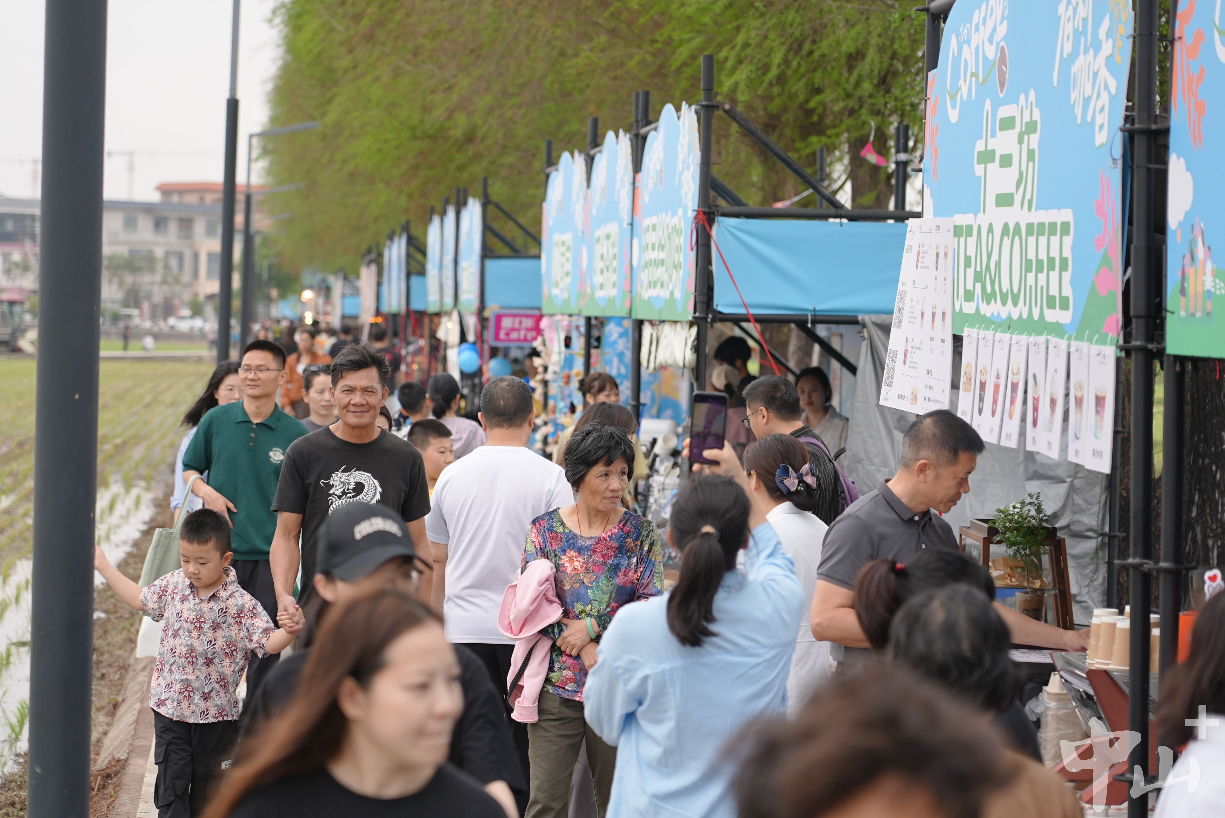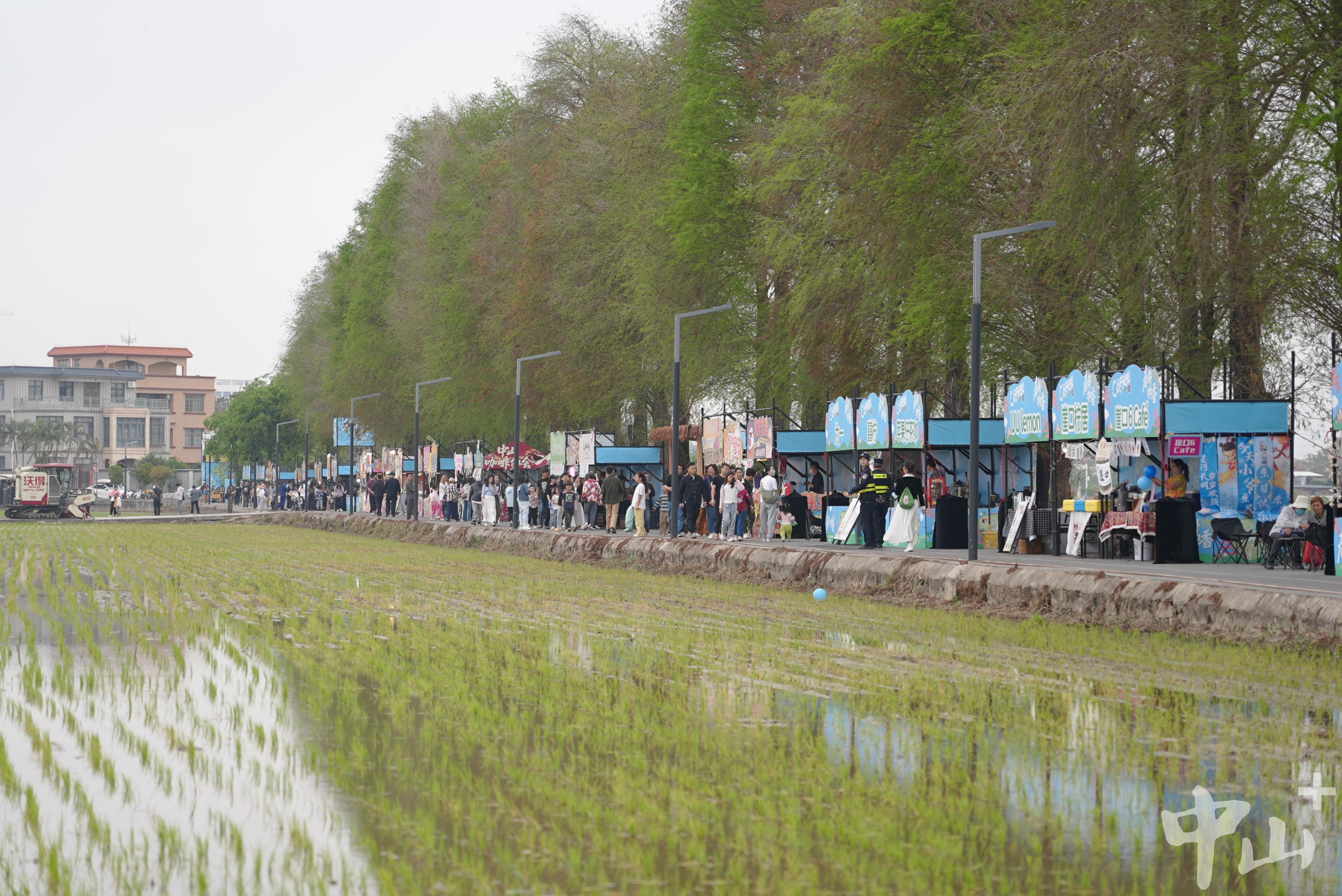千亩稻田禾苗新绿,刚完成春耕任务的“威武”农机一字排开,不远处咖啡飘香、客流涌动,一条绵延数百米的乡村咖啡美食集市在崖口村水杉路亮相。