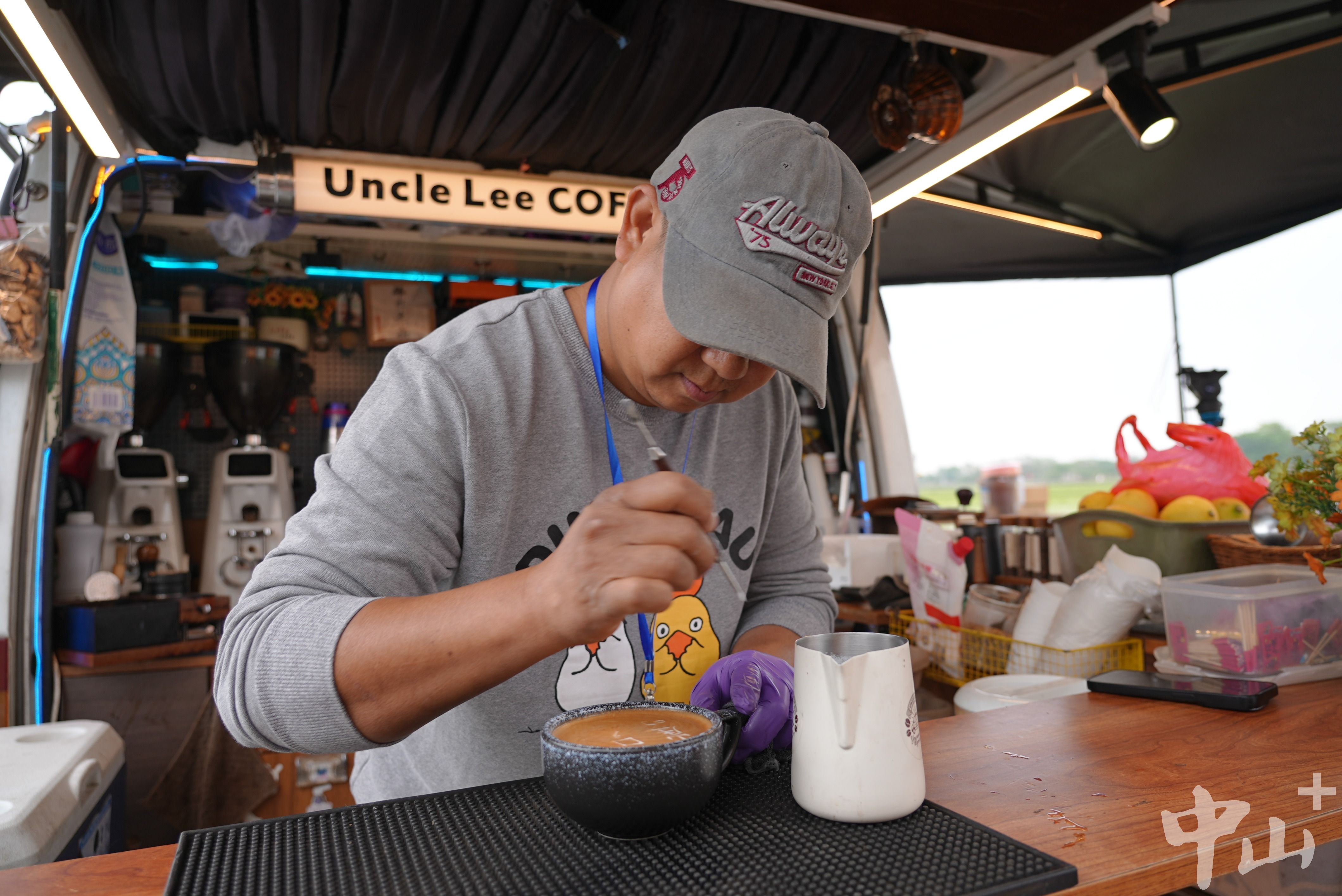 来自江门的李广成开着自己的咖啡车在全国各地跑了多年,凭借着精巧的拉花技艺,所到之处都收获满满。“以乡村为主题的咖啡节,中山好像还是第一个办,挺新颖的。”在他看来,中山的乡村很漂亮,很适合周末漫游,“即使不是工作,我可能也会自己开着车过来玩。”