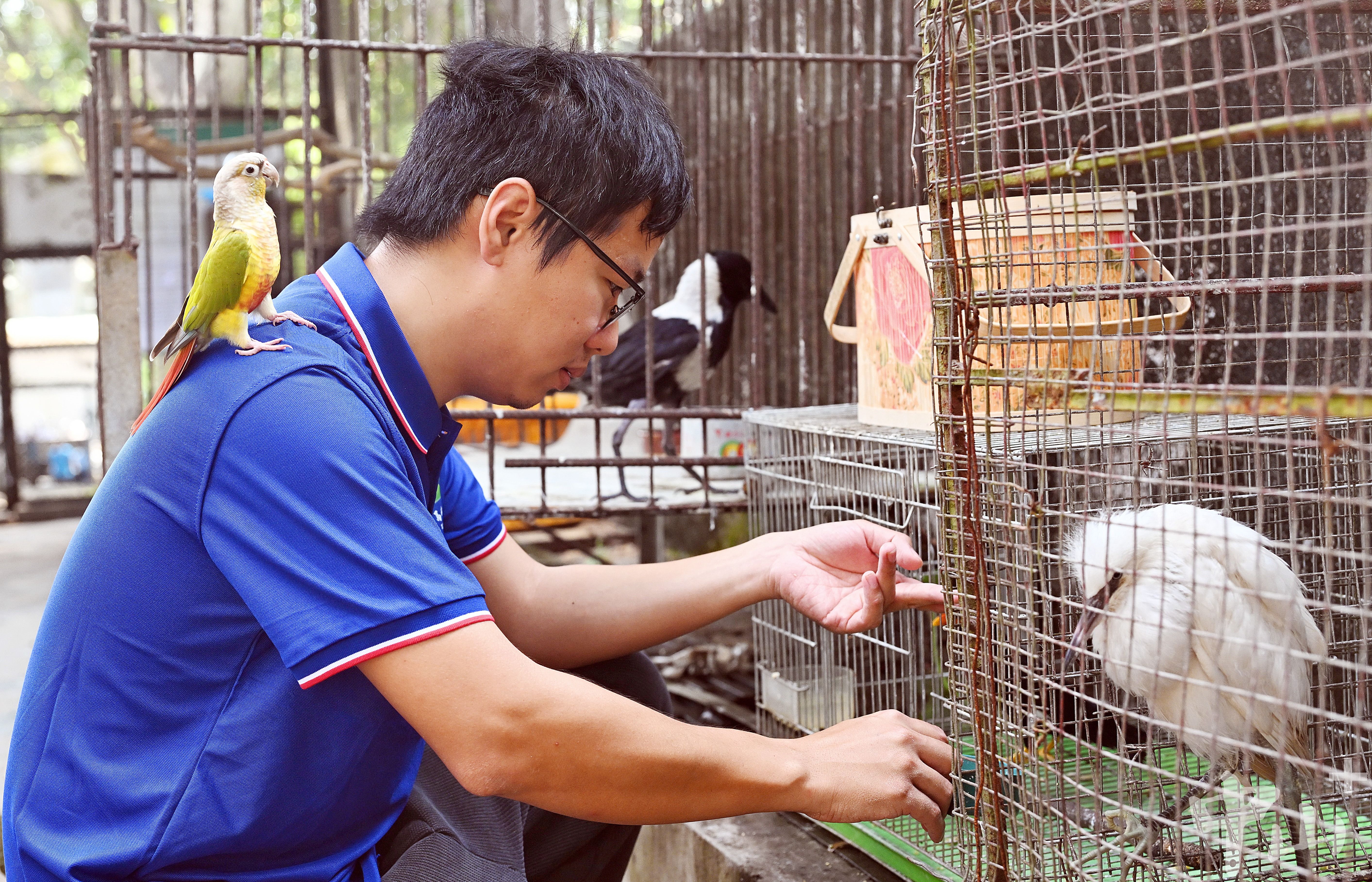 工作日清晨七点半,区肇和已开始忙碌起来。他先给鸟儿刷水盆食盆,再换饲料,仔细观察每只鸟的状态,这是每日判断它们有没有生病的最基础工作。