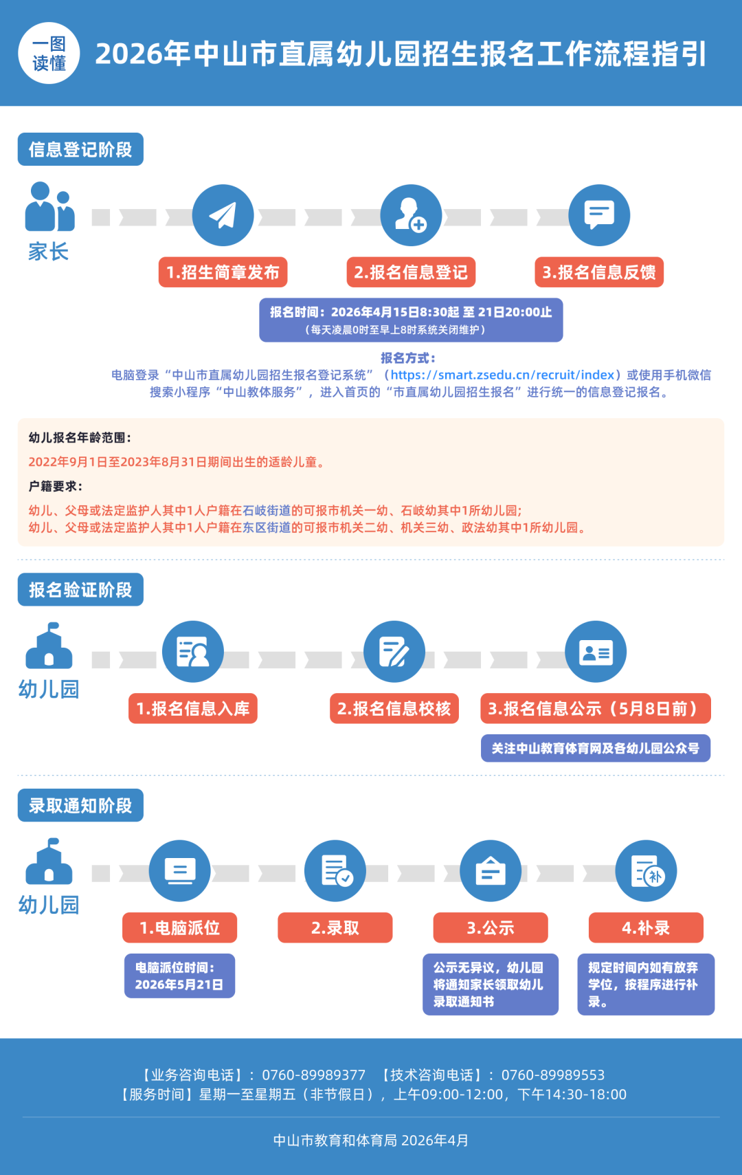 电脑登录“中山市直属幼儿园招生报名登记系统”或使用手机微信搜索小程序“中山教体服务”,进入首页的“市直属幼儿园招生报名”进行统一的信息登记报名。