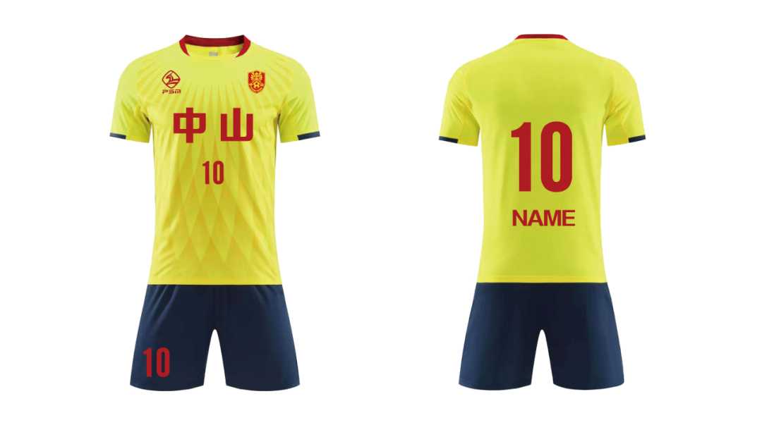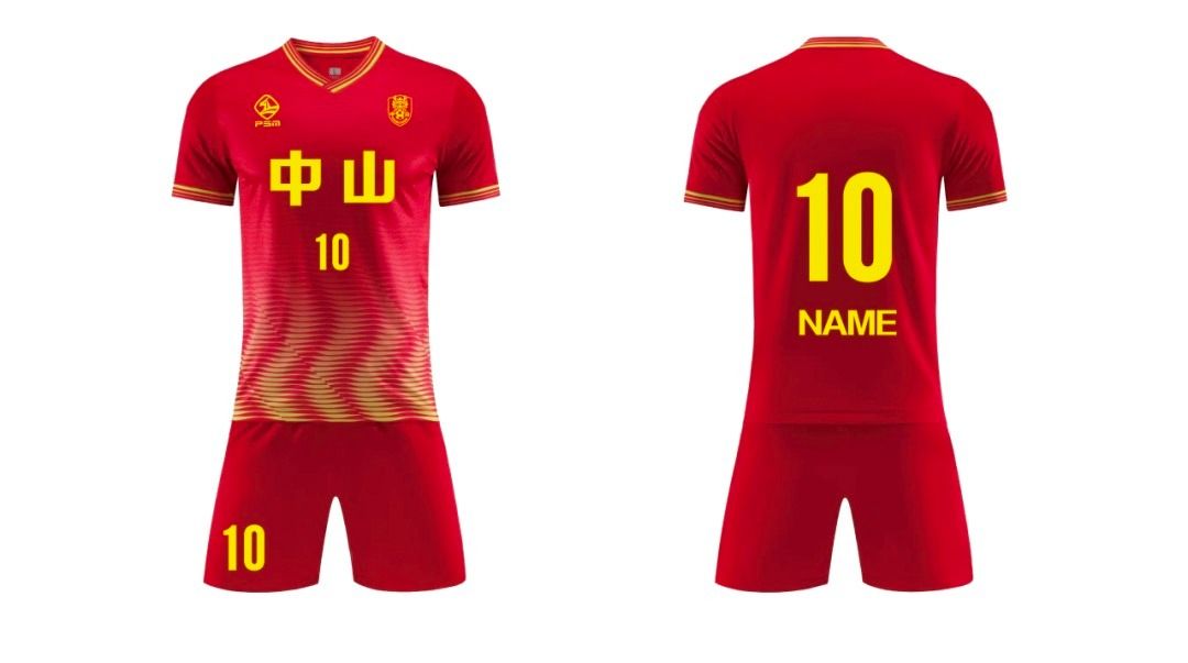 中山队主场队服定名“金菊黄”,其灵感源自中山的市花——菊花,放射状纹理提取菊花花瓣的舒展形态,以明丽金黄为主色调,尽显城市文化底蕴与球队蓬勃朝气。客场队服定名“博爱红”,水波纹纹样呼应中山水乡风貌,承载中山“博爱”城市精神。整套设计将地域文化与足球精神深度融合,凸显中山特色,展现球队奋勇拼搏、“粤T越强”的竞技风貌。整套队服兼顾舒适性与观赏性,将地域文化符号与足球运动的功能性融合,让队员们在赛场上既能展现竞技风采,也能传递中山文化魅力。