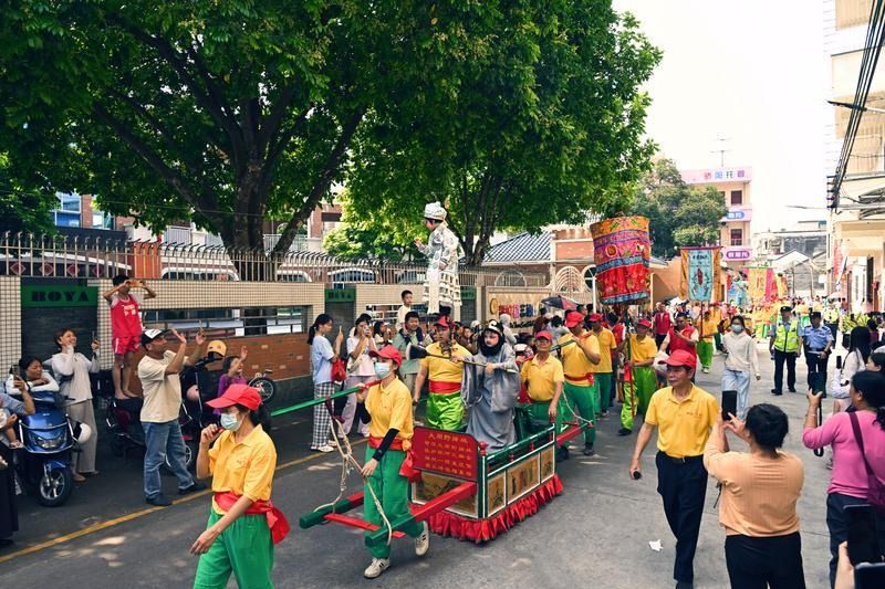 黄圃飘色起源于明末清初,最初是当地民众依托北帝诞举行的春耕祈福巡游,祈求风调雨顺、农事安康。历经数百年传承,三月三飘色已成为当地雷打不动的民俗传统。“快到三月三时,就有群众表示强烈期盼,什么时候有飘色?会不会经过我家?”三社社区飘色活动组织者、省级非物质文化遗产代表性传承人苏照恩说。