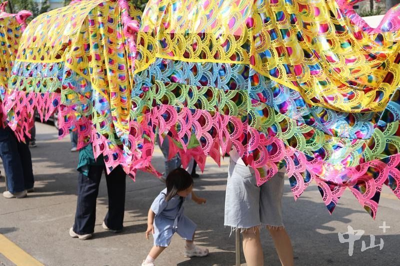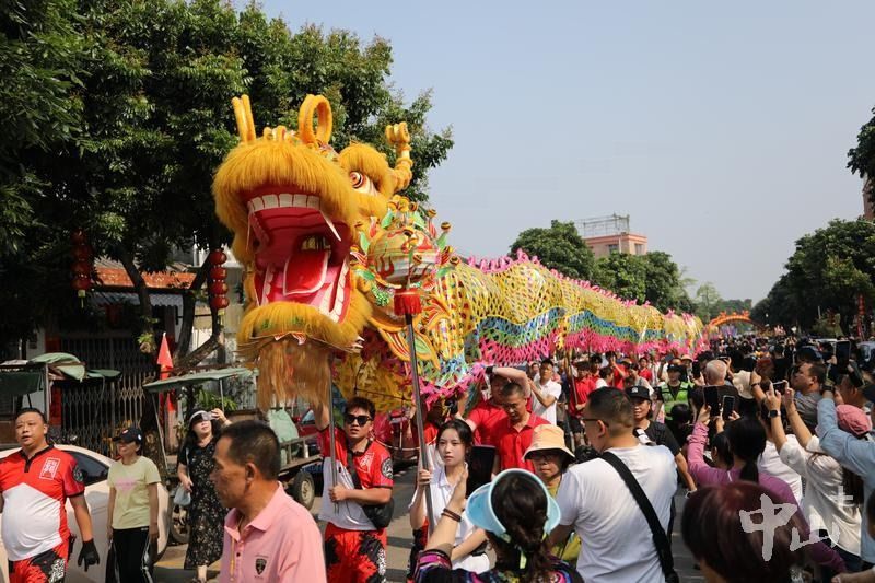 当天上午9时整,龙头环村北帝庙前鞭炮齐鸣、锣鼓喧天,民俗巡游正式启幕。头锣、灯笼、牌匾先行开道,西游记、八仙等主题花车依次亮相,凤鹤、舞狮队伍紧随其后,长达202.6米的中山最长金龙压轴登场,气势十足。