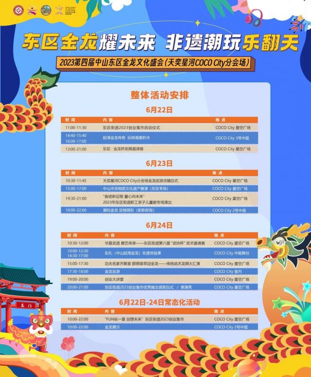 “东区金龙耀未来 非遗潮玩乐翻天”2023第四届中山东区金龙文化盛会中山天奕星河COCO City分会场活动结合端午假期,营造弘扬优秀传统文化的良好氛围,动员全社会共同关注和保护文化遗产,同时紧扣时代主旋律,兼顾时尚特点,联动各界资源,推动文旅商融合发展。