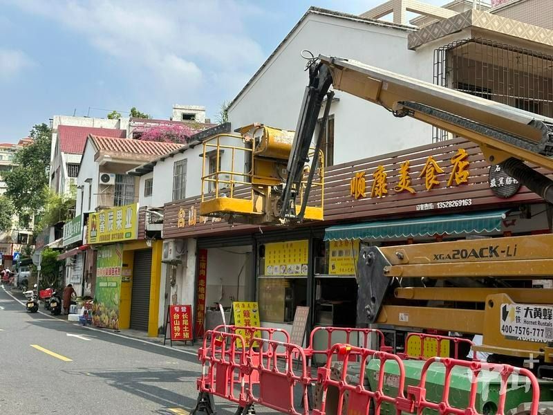 秋日午后,阳光洒满龙井街巷,烟火气扑面而来。小巷一侧,黄色作业车静静停靠,工人们在阴凉处稍作休息;另一侧,刚翻新不久的蓝色外立面格外醒目,骑摩托车、自行车的行人在平坦道路上有序穿梭。