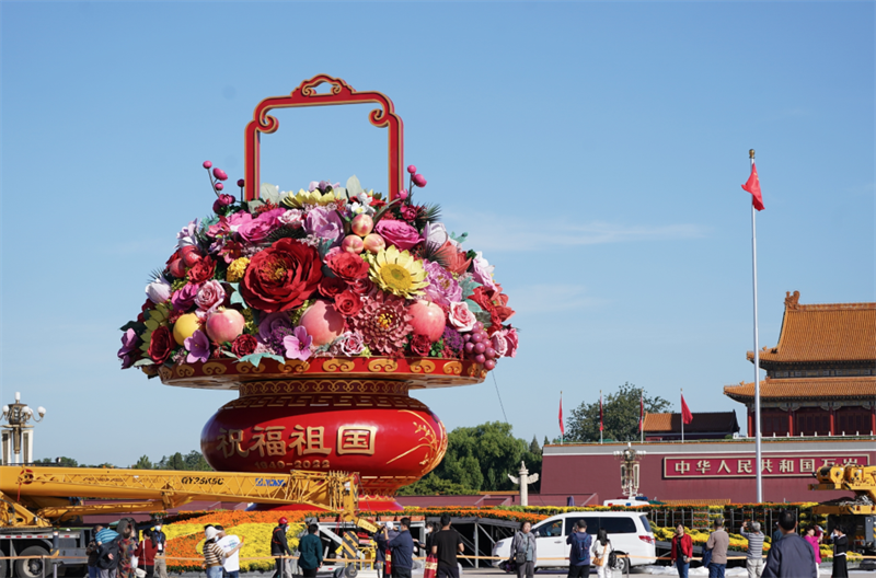 经过深夜吊装,天安门广场上的“祝福祖国”巨型花果篮今晨与市民游客见面了。整个国庆摆花工作将在9月25日全部完成。