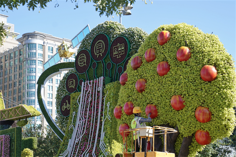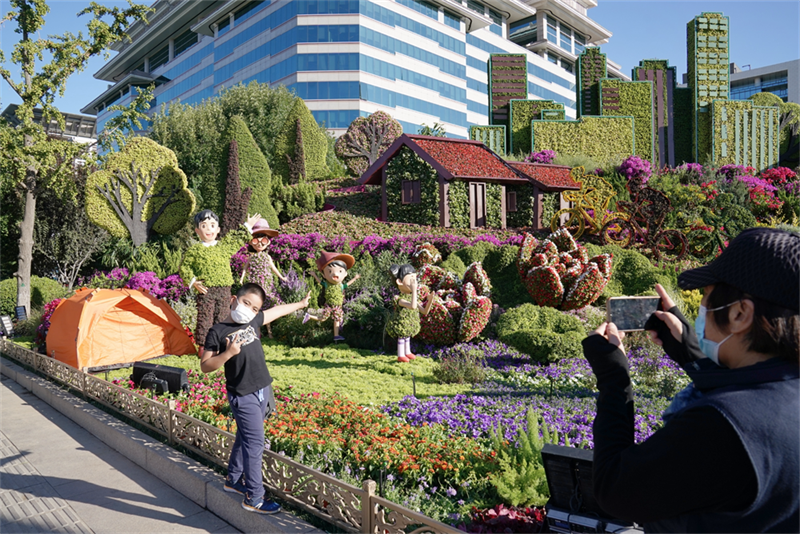 今年国庆期间,长安街沿线的主题花坛增至14处。东长安街的7处花坛以新发展理念为主线,展示祖国的辉煌成就;西长安街的7处花坛的主线则是以人民为中心共创美好生活,描绘的是身边触手可及的幸福生活。