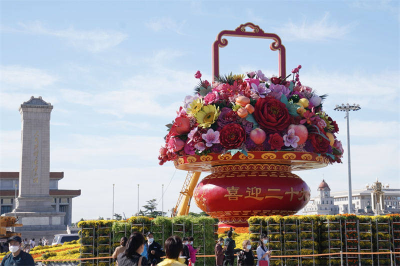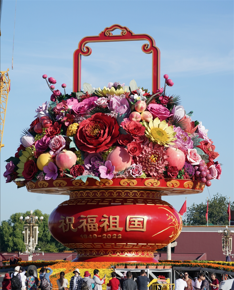 “我前天就在网上预约了广场参观,带家人一起来跟花果篮合个影。”市民张城一一数着篮里的花果:花儿有十种,包括牡丹、月季、菊花等;果也是十种,有苹果、石榴、葡萄、西瓜、大桃,“硕果累累,十全十美,这寓意太好了”。