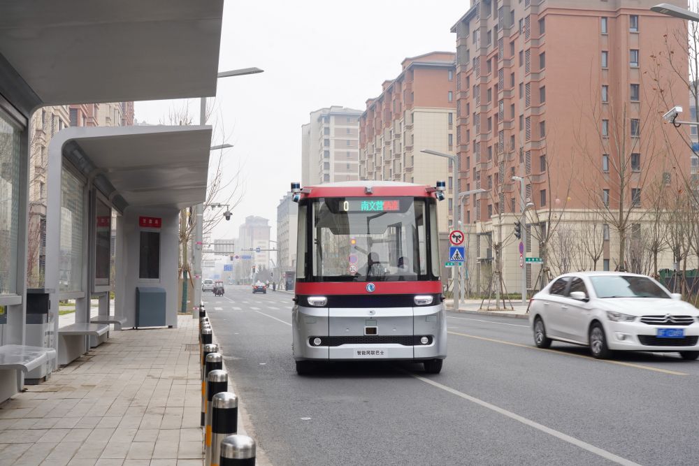 智能网联巴士901线测试车在雄安新区容东片区道路上行驶(3月20日摄)。新华社记者 牟宇 摄