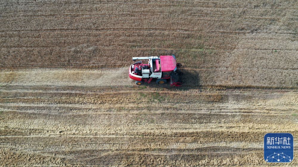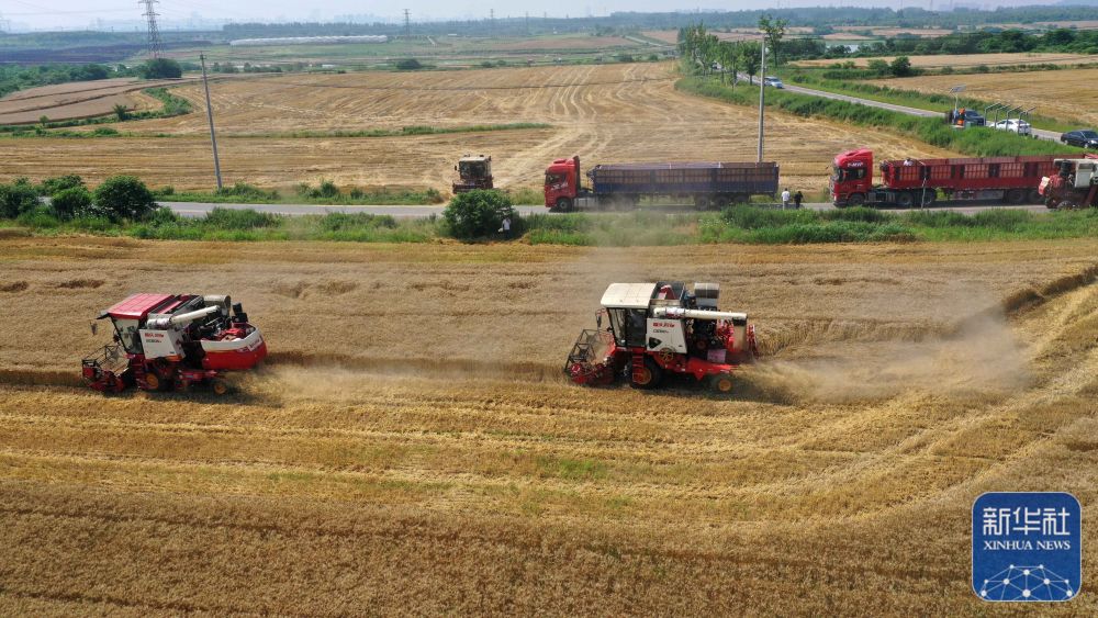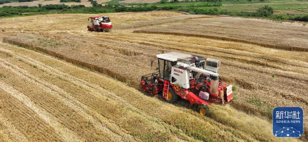 ↑6月2日,在合肥市蜀山区小庙镇段冲村,农机手操作机械设备收割小麦(无人机照片)。新华社发(陈三虎 摄)