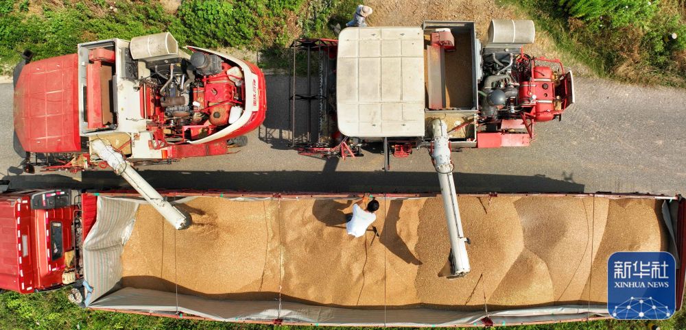 ↑6月2日,在合肥市蜀山区小庙镇段冲村,收割机将小麦装车(无人机照片)。新华社发(葛庆钊 摄)