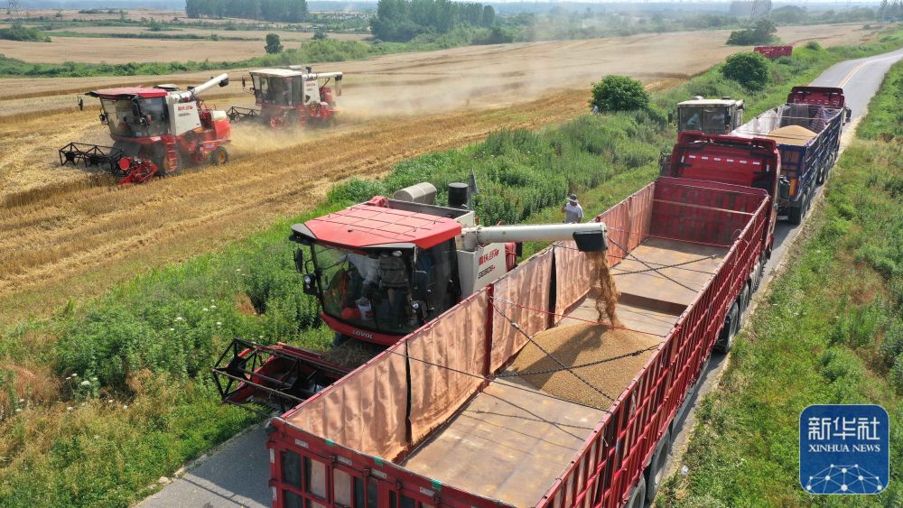 ↑6月2日,在合肥市蜀山区小庙镇段冲村,收割机将小麦装车(无人机照片)。新华社发(陈三虎 摄)