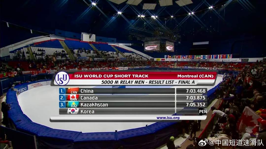 当地时间10月29日,在加拿大蒙特利尔举行的2023-2024赛季短道速滑世界杯第二站比赛中,由林孝埈、刘少林、刘少昂、孙龙组成的中国队发挥出色,力压加拿大队和哈萨克斯坦队,以7∶03.468的成绩获得5000米男子接力金牌。