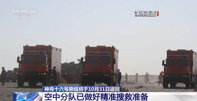 神舟十六号乘组三名航天员10月31日将返回东风着陆场,担负搜救回收任务的空中分队,将使用5架直升机开展搜救回收任务。任务前夕,人员、装备已经进行了充分的训练,做好了迎接神舟十六号乘组返回的准备。