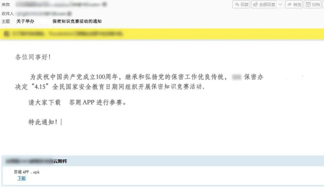 夏日炎炎,蝉鸣聒噪,南方的夏天格外湿热,坐在办公室的小张被空调的冷气围裹着,忽感一丝寒意。就在他准备伸个懒腰之时,“叮咚”,单位群聊天窗口收到了新消息,通知大家参加保密知识竞赛,并要求下载安装某手机应用程序。与此同时,小张的工作邮箱也收到了一封陌生邮件。