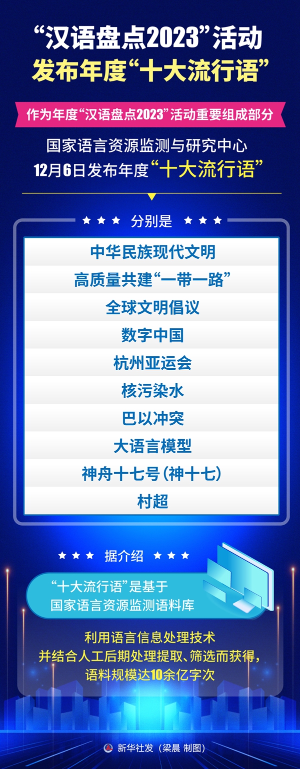 作为年度“汉语盘点2023”活动重要组成部分,国家语言资源监测与研究中心12月6日发布年度“十大流行语”,分别是:中华民族现代文明、高质量共建“一带一路”、全球文明倡议、数字中国、杭州亚运会、核污染水、巴以冲突、大语言模型、神舟十七号(神十七)、村超。