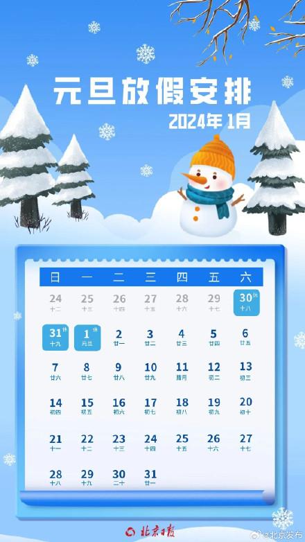 2024年元旦假期放假时间为2023年12月30日至2024年1月1日,共三天。本周六(12月16日),旅客可以购买假期首日(12月30日)的火车票,12月18日可购买2024年1月1日的返程火车票。