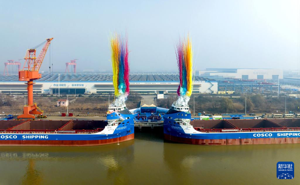 当日,国产万吨级电动集装箱船“中远海运绿水01”、“中远海运绿水02”正式命名交付,将于近期开启首航。