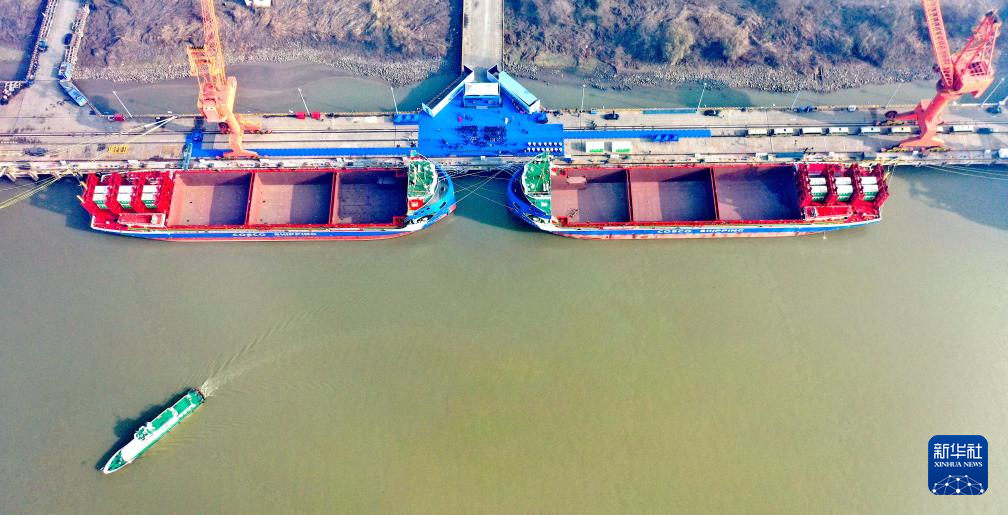 12月28日拍摄的国产万吨级电动集装箱船“中远海运绿水01”(左)、“中远海运绿水02”(无人机照片)。