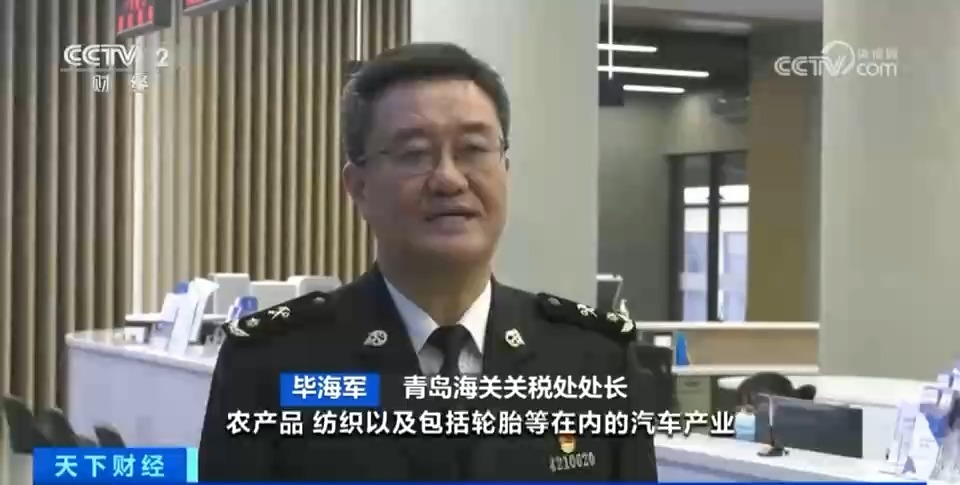 青岛海关关税处处长 毕海军:山东省主要的受益产业为农产品、纺织以及包括轮胎等在内的汽车产业。据测算,协定生效后首年,山东企业就可以节省关税成本约2000万元。