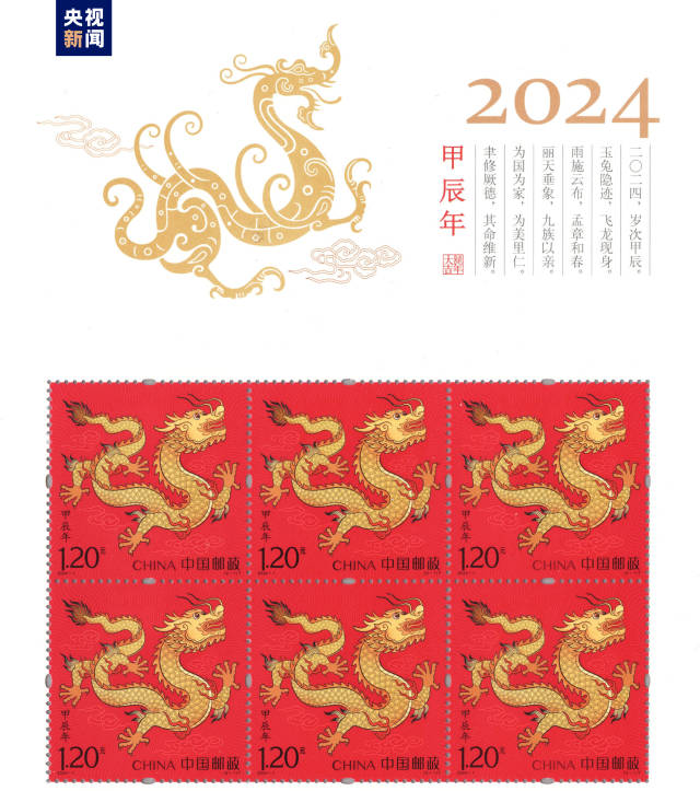1月5日,中国邮政发行《甲辰年》特种邮票,1套2枚,主打红、金、黑经典三色。