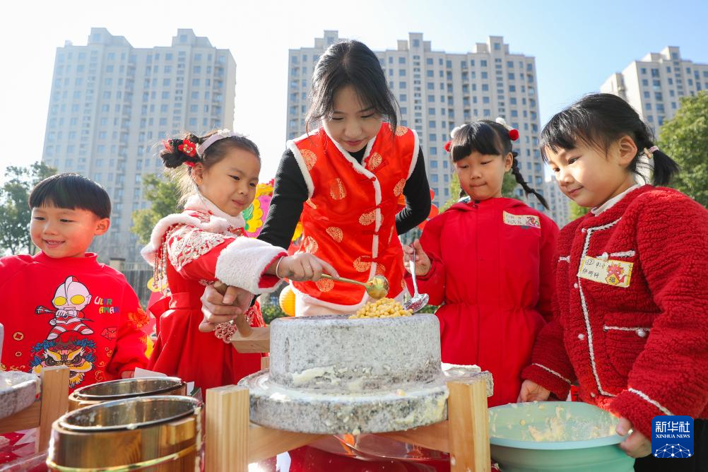 1月17日,在位于浙江省湖州市德清县武康街道的千秋幼儿园,小朋友在老师的指导下磨豆腐。
