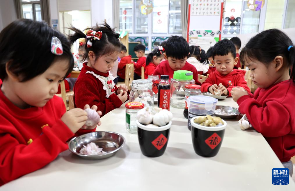 1月17日,在河北省石家庄市藁城区通安幼儿园,小朋友在剥蒜,准备腌制腊八蒜。