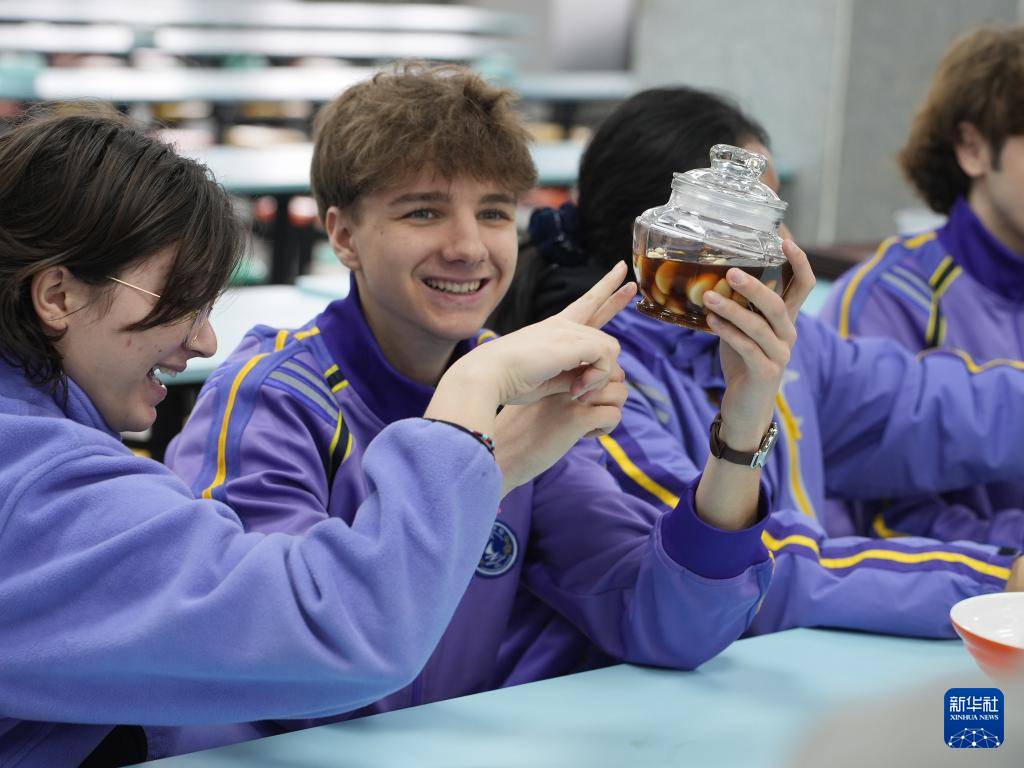 1月17日,河北省石家庄市第四十二中学的留学生体验腊八蒜制作。