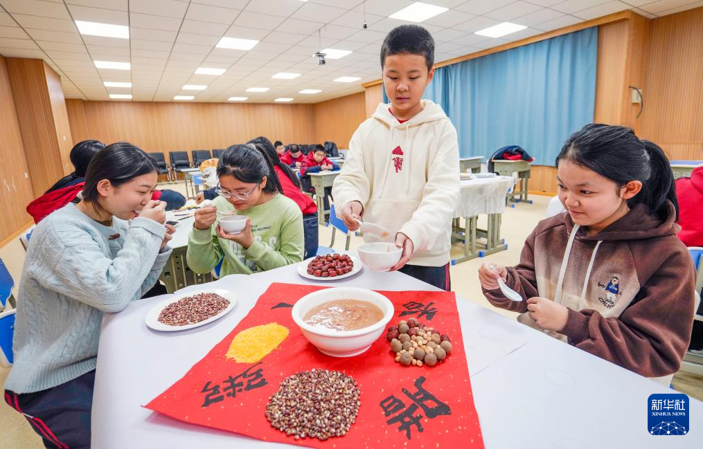 1月17日,河北省遵化市第三中学的学生在品尝腊八粥。
