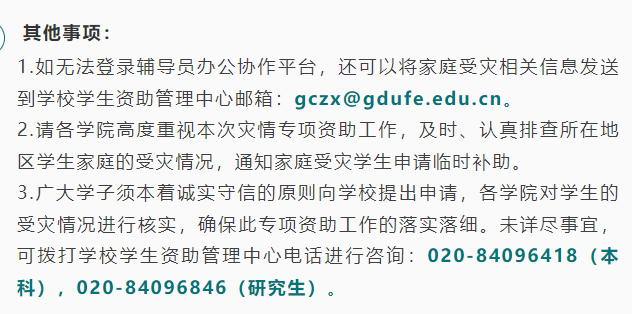 广州中医药大学开放专项补助通道,明确提出因灾情导致家庭经济临时困难的,可与辅导员老师联系申请临时困难补助。各学院、研究生培养基地根据受灾学生实际情况,协助学生申请学校临时困难补助。