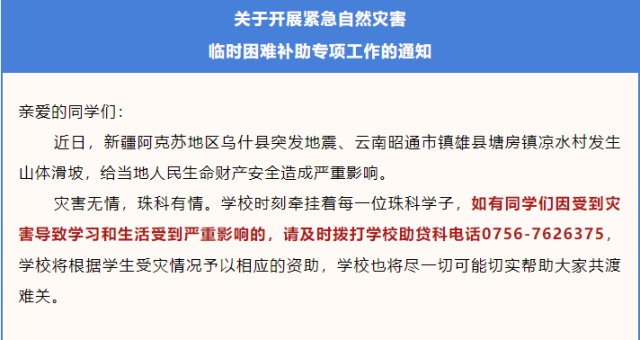 珠海科技学院在通知中提出,如有同学们因受到灾害导致学习和生活受到严重影响,请及时拨打学校助贷科电话0756-7626375,学校将根据学生受灾情况予以相应的资助,尽一切可能切实帮助大家共渡难关。