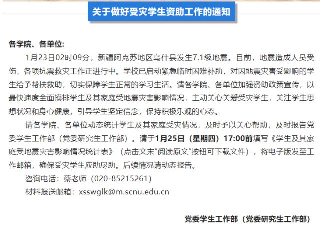 暨南大学启动地震受灾学生情况摸排工作,如学生家庭身处受灾地区,因地震、暴雪等自然灾害受到损失,对家庭经济造成临时困难的,可及时向学院辅导员反馈。学校将根据学生具体困难情况安排发放临时困难补助等慰问措施。