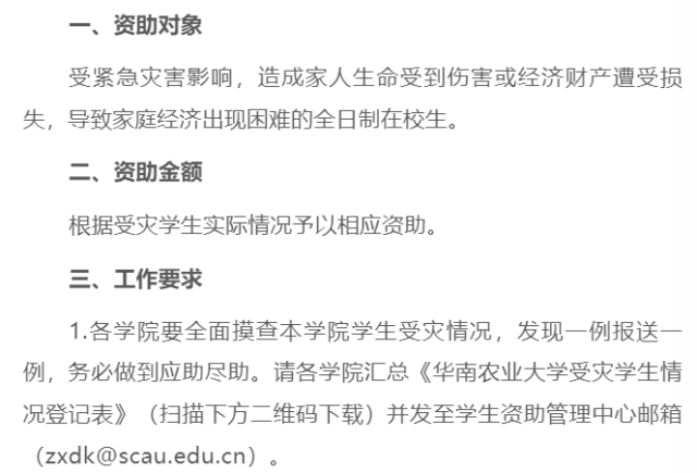 华南农业大学提出,对受紧急灾害影响,造成家人生命受到伤害或经济财产遭受损失,导致家庭经济出现困难的全日制在校生进行资助。资助金额根据受灾学生实际情况予以相应资助。同时,该校要求各学院密切关注受灾家庭学生,确保受灾学生安心学习、生活,做好受灾学生的心理帮扶。