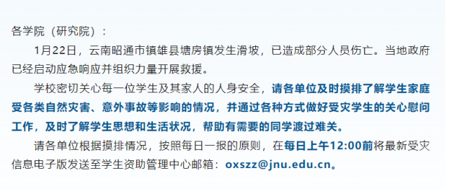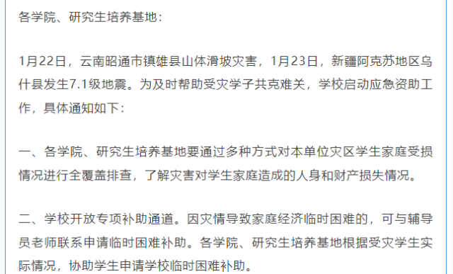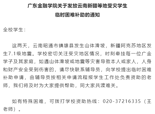 广东财经大学通知,为受本次山体滑坡及地震影响,造成共同生活的直系亲属遇难(或失联)、伤害(如致残、丧失生活、劳动能力等)、房屋受损、倒塌或遭受其他重大损失,导致家庭经济出现困难的学生(含本科生和研究生)提供资助。申请时间为1月23日—3月1日。登录辅导员办公协作服务平台——资助管理系统——临时困难补助申请——云南昭通市镇雄县山体滑坡及新疆乌什县地震灾情专项资助,进行申请。
