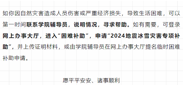 深圳大学发布通知,学生如因自然灾害造成人员伤害或严重经济损失,导致生活困难,可以第一时间联系学院辅导员,说明情况,寻求帮助。如有需要,可登录网上办事大厅,进入“困难补助”,申请“2024地震冰雪灾害专项补助”,或由学院辅导员在网上办事大厅提名临时困难补助申请。